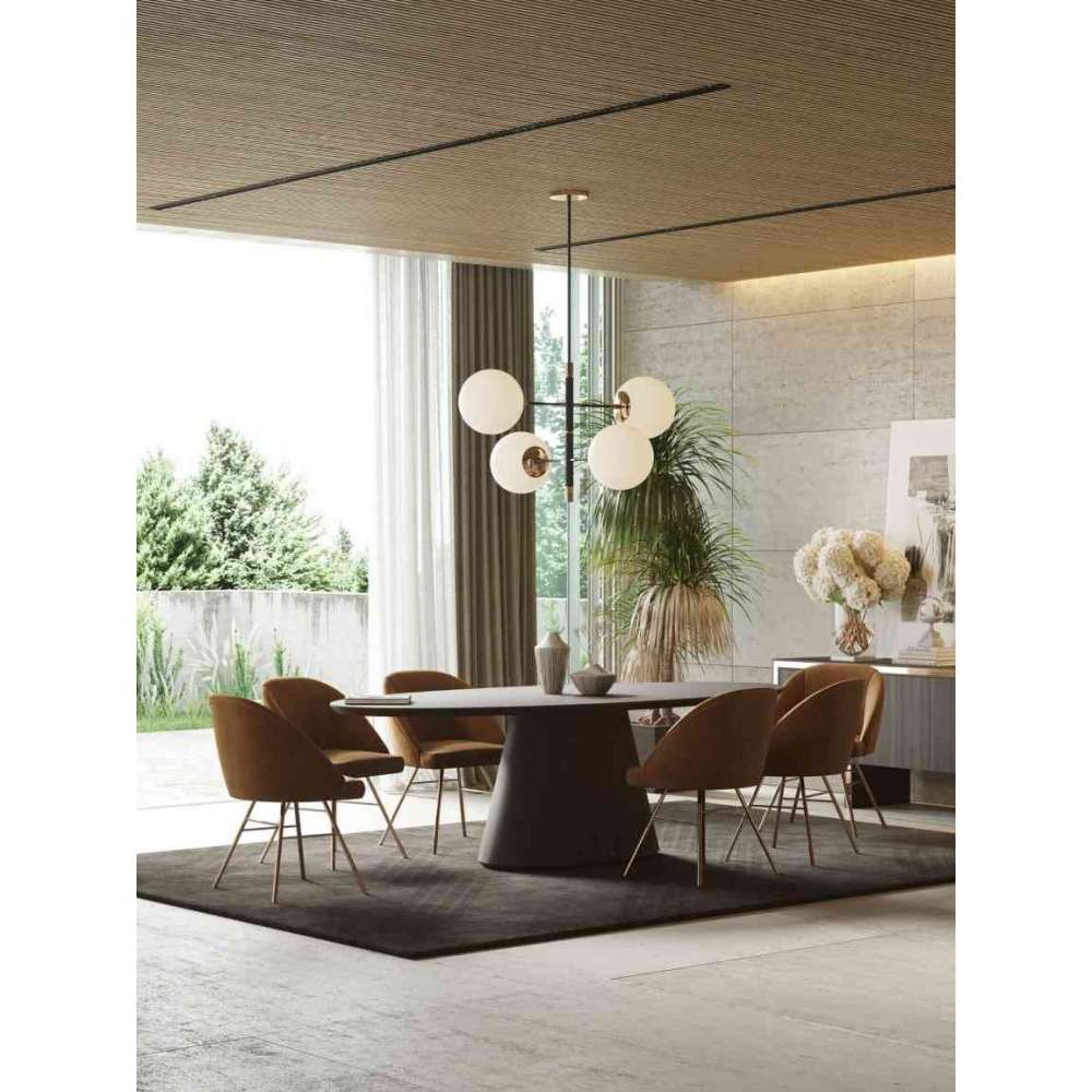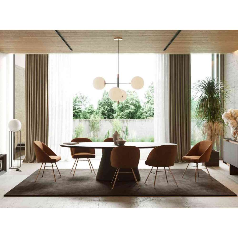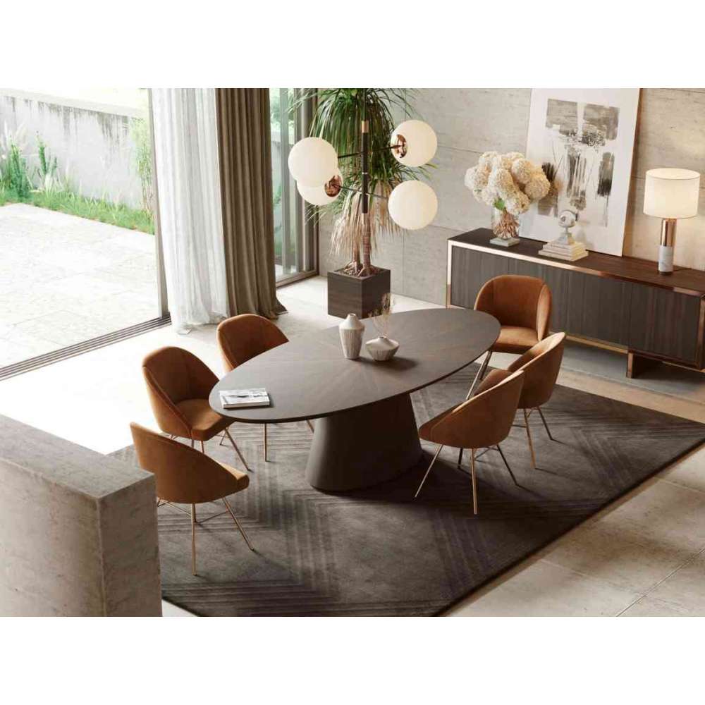 Stół do jadalni Kelly ma design, który Cię oszołomi. Ten owalny stół jadalny to ekscentryczny element stworzony z myślą o ekstrawaganckich jadalniach. Idealny dodatek do luksusowych restauracji i ekskluzywnych jadalni. Bawiąc się funkcjonalnością i designem, jego owalny blat delikatnie spoczywa w dwóch solidnych kolumnach.