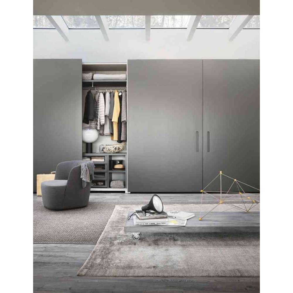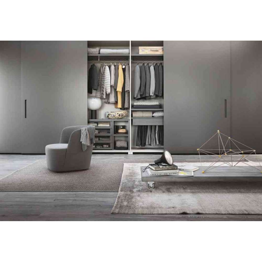 Doskonałe połączenie technologii i estetyki, wersje z wyrównanymi drzwiami szafy Armadio al centitro (na miarę) posiadają wyrafinowany system otwierania kompasu, który umożliwia ustawienie w jednej płaszczyźnie (bez podwójnej grubości typowej dla przesuwnych drzwi). Dlatego ma tę zaletę, że tworzy idealnie poziomą powierzchnię bez występów i wgłębień. Dostępny w ponad 40 matowych lub błyszczących kolorach z katalogu Lema. Istnieje również wiele możliwości indywidualizacji wnętrz: różne wykończenia dostępne w katalogu oraz szeroka gama wyposażenia zaprojektowanego w celu racjonalizacji przestrzeni. Szeroka gama obejmująca różne typy szafek szufladowych z frontem ze szkła lub drewna, po szklaną witrynę na paski i krawaty; niezwykle praktyczne, wyjmowane schowki na spodnie, bieliznę i buty. Asortyment uzupełniają cenne detale, takie jak światło wbudowane w półkę, boki lub drążek do wieszania ubrań oraz eleganckie akcesoria, takie jak skórzane i materiałowe dywaniki do szuflad, skórzane pudełka do przegródek na koszule i tekstylne do szuflad. sezonowe zmiany.