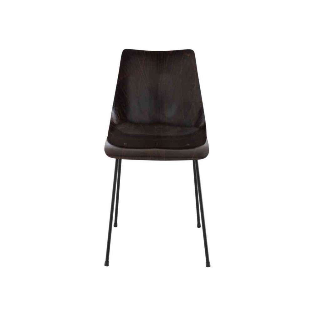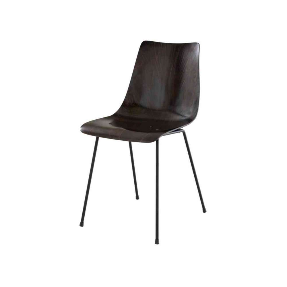 Krzesło z ergonomiczną skorupą z ciemnobrązowej barwionej żywicy, formowanej, prasowanej wielowarstwowej płyty bukowej w błyszczącym wykończeniu. Podstawa z czarnej lakierowanej okrągłej stali z ochronnymi końcówkami na nogach.