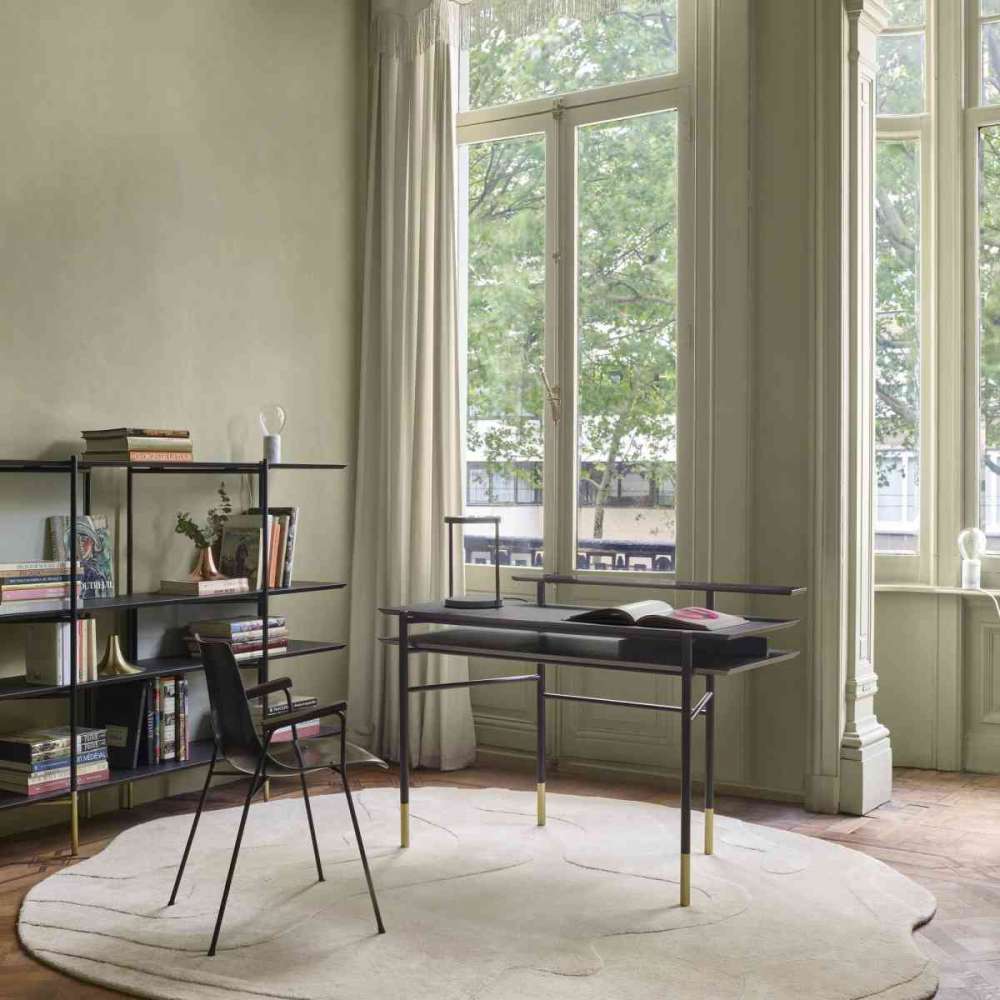 Mostek z ergonomiczną powłoką z ciemnobrązowej, żywicowanej, formowanej, prasowanej wielowarstwowej płyty bukowej z błyszczącym wykończeniem. Podłokietniki z litego drewna bukowego, barwione na kolor muszli. Podstawa z czarnej lakierowanej okrągłej stali z ochronnymi końcówkami na nogach.