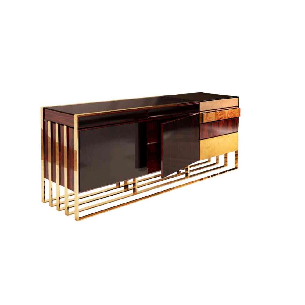 Struktura z drewna żelaznego i polerowanego mosiądzu. Szuflady skomponowane z forniru z lotu ptaka, forniru wiązu czeczota, mozaiki forniru ironwood, forniru orzechowego, forniru klonowego, wykończone lakierem na wysoki połysk. Blat i fronty drzwi z przydymionego szkła. Wnętrza pokryte są złotem płatkowym.