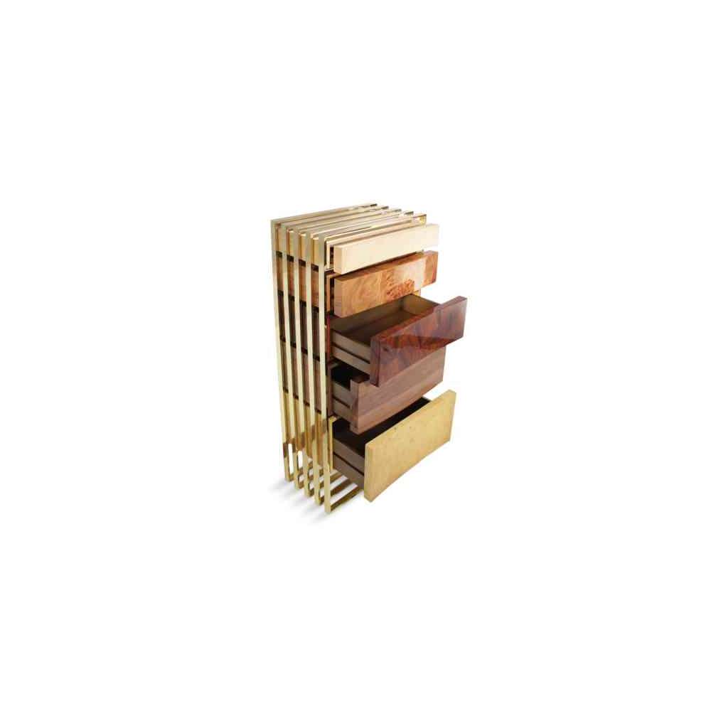 Struktura z polerowanego mosiądzu. Szuflady skomponowane z forniru z lotu ptaka, forniru wiązu czeczota, mozaiki forniru ironwood, forniru orzechowego, forniru klonowego, wykończone lakierem na wysoki połysk. Wnętrza szuflad pokryte złotem płatkowym.