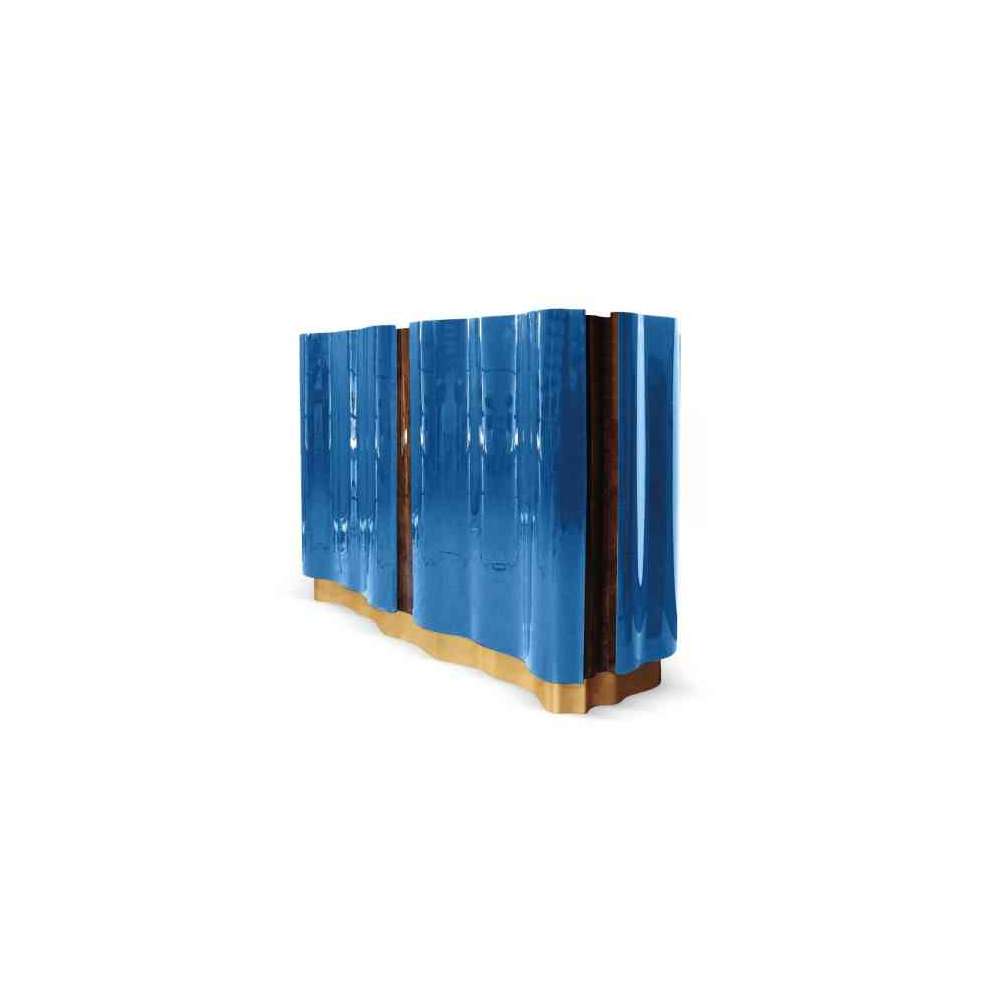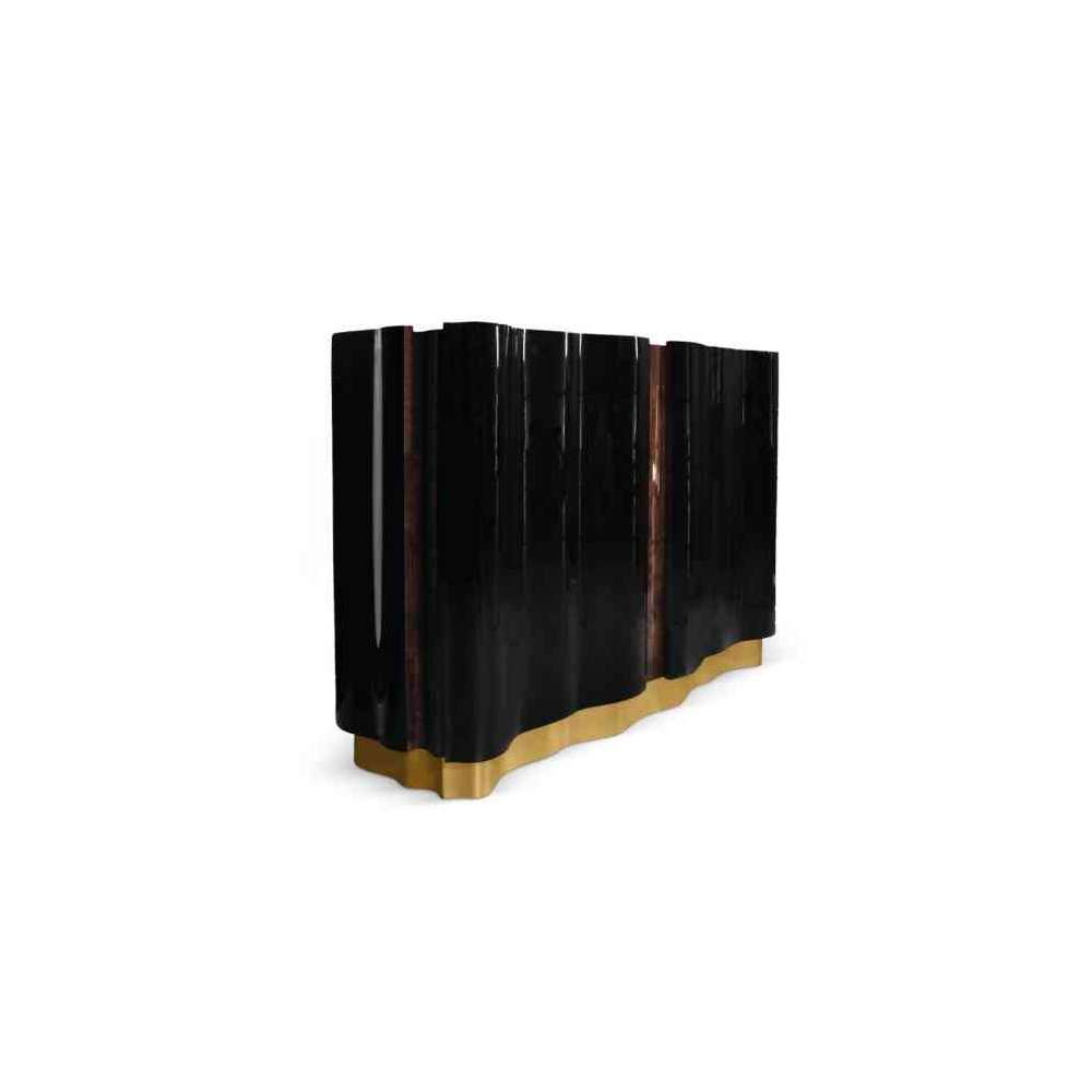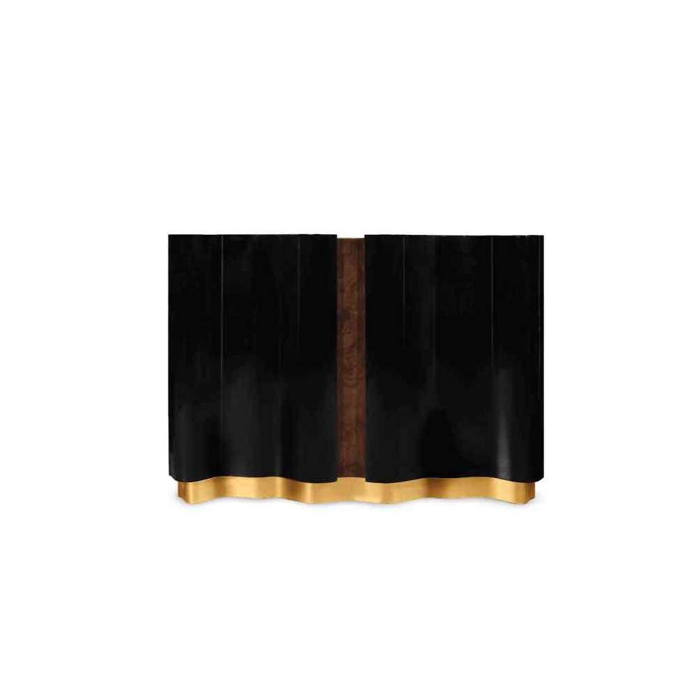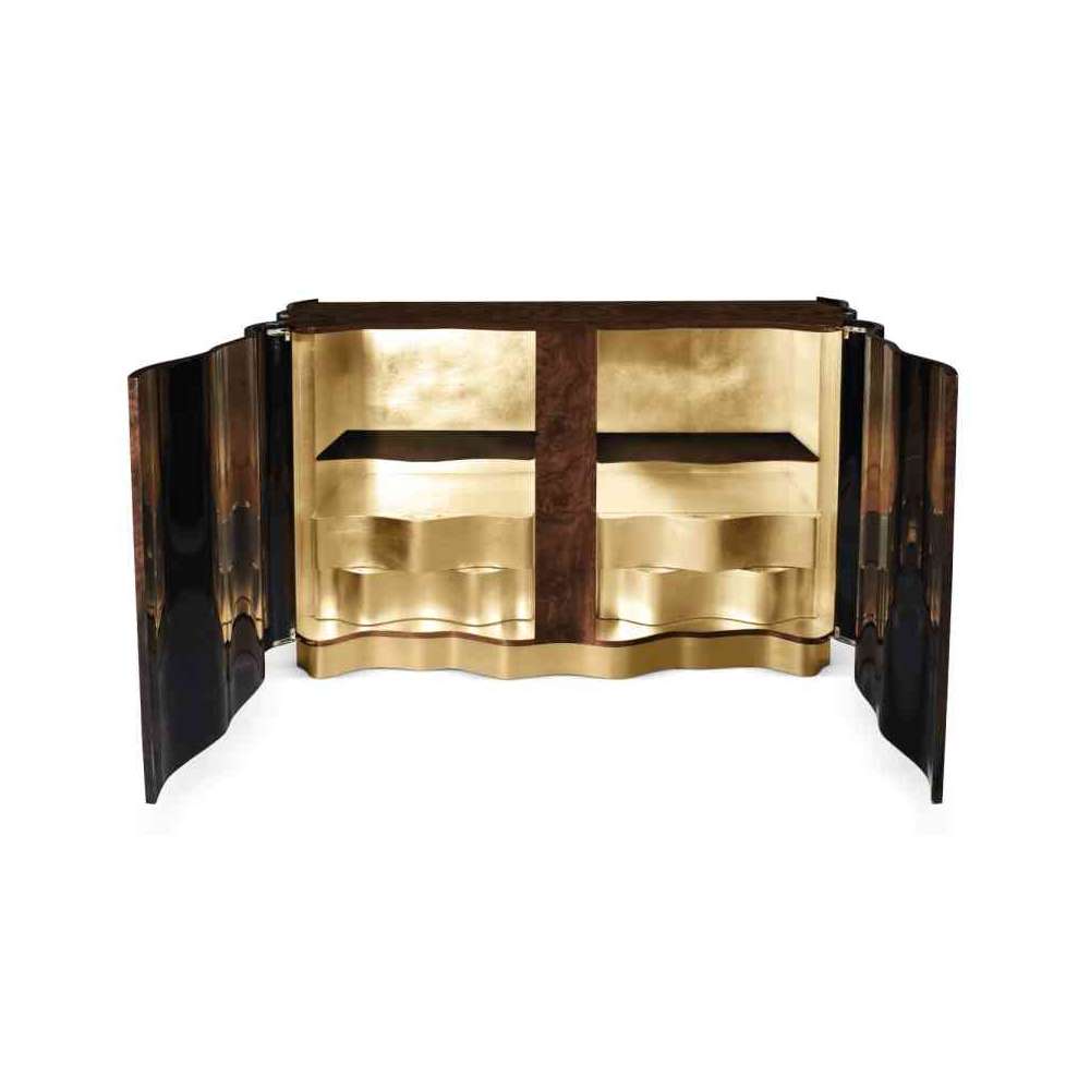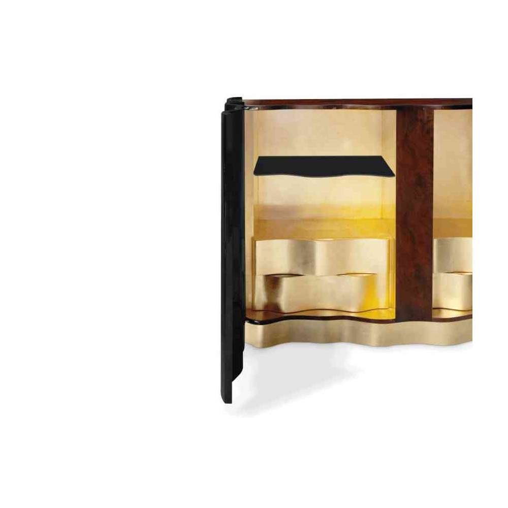 Wnętrze kredensu HORIZON wykończone jest korzeniem drewna orzecha z półkami ze szkła wędzonego, a szuflady są w kolorze złotym drewno powlekane wyłożone aksamitem. Luksusowa podstawa pasuje do wewnętrznych szuflad, dzięki czemu kredens Horizon jest idealnym wyborem do wystroju Twojego domu.