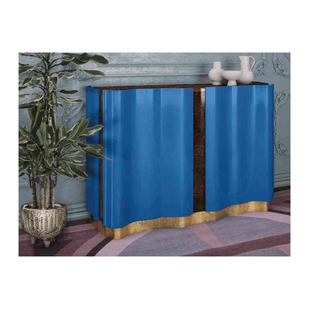 Materiały: Góra konsoli w korzeniu drewna orzechowego, struktura lakierowana drewno z drewnianą podstawą pokrytą złotem, wykończone lakierem na wysoki połysk. Wnętrze wykończone w korzeniu drewna orzechowego z półkami ze szkła dymionego. Szuflady z drewna pokrytego złotem, wyłożone aksamitem.