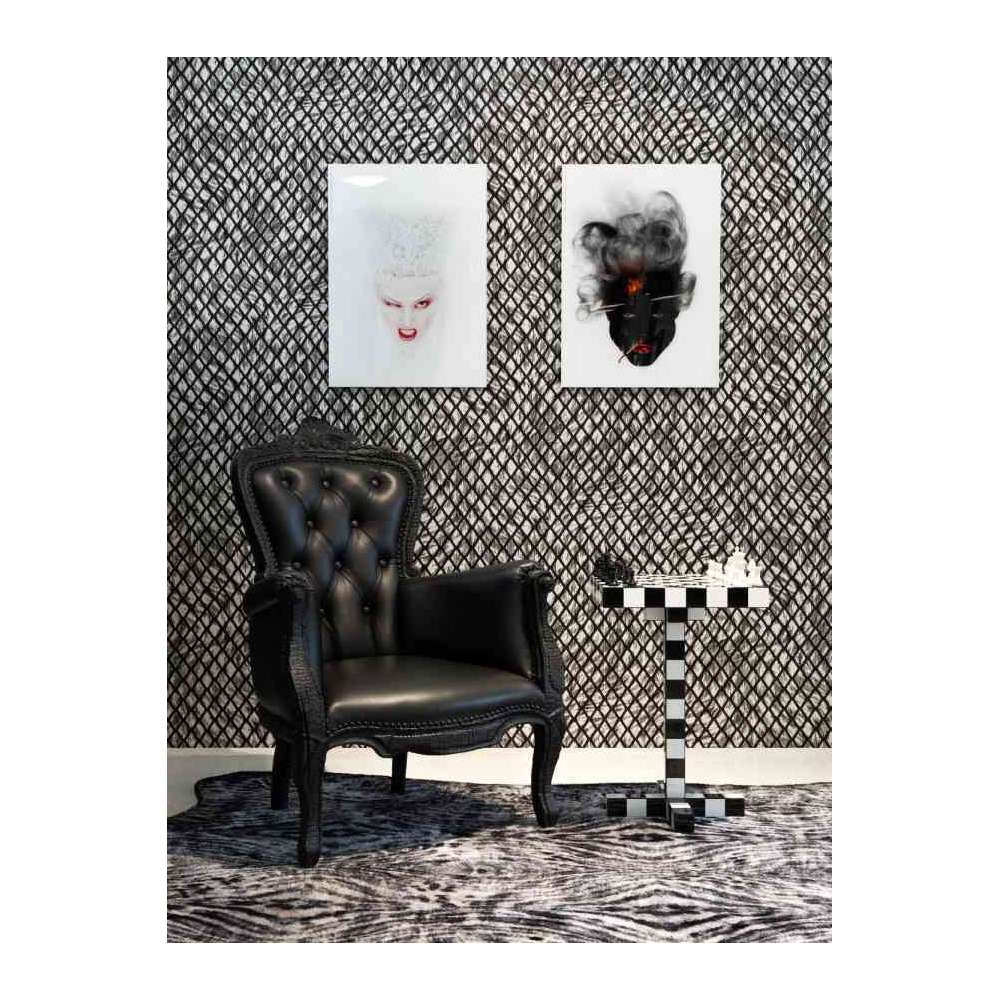 "Dekoracja na stoliku bocznym może służyć do grania w gry. Stół do rozrywki, rywalizacji i sprytu." Materiał: Różne rodzaje drewna, wewnętrzna rama stalowa, lakier o wysokim połysku. Kolory: biały, czarny. Stół szachowy jest częścią kolekcji stołów moooi Fotograf Maarten van Houten Copyright Moooi bv