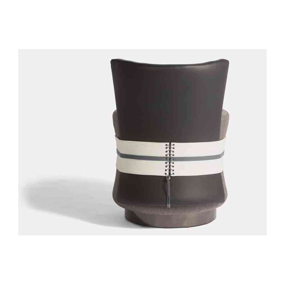 Fascetta to ręcznie robione we Włoszech krzesło inspirowane gorsetem z ozdobnymi koronkami z wyrafinowanym akcentem. Podstawa może być opcjonalnie stała, regulowana lub z kółkami. Krzesło jest pokryte tkaniną na siedzisku i skórą z tyłu, ale jest dostępne w wersji nabuk lub aksamicie oraz w innych rozmiarach na życzenie.