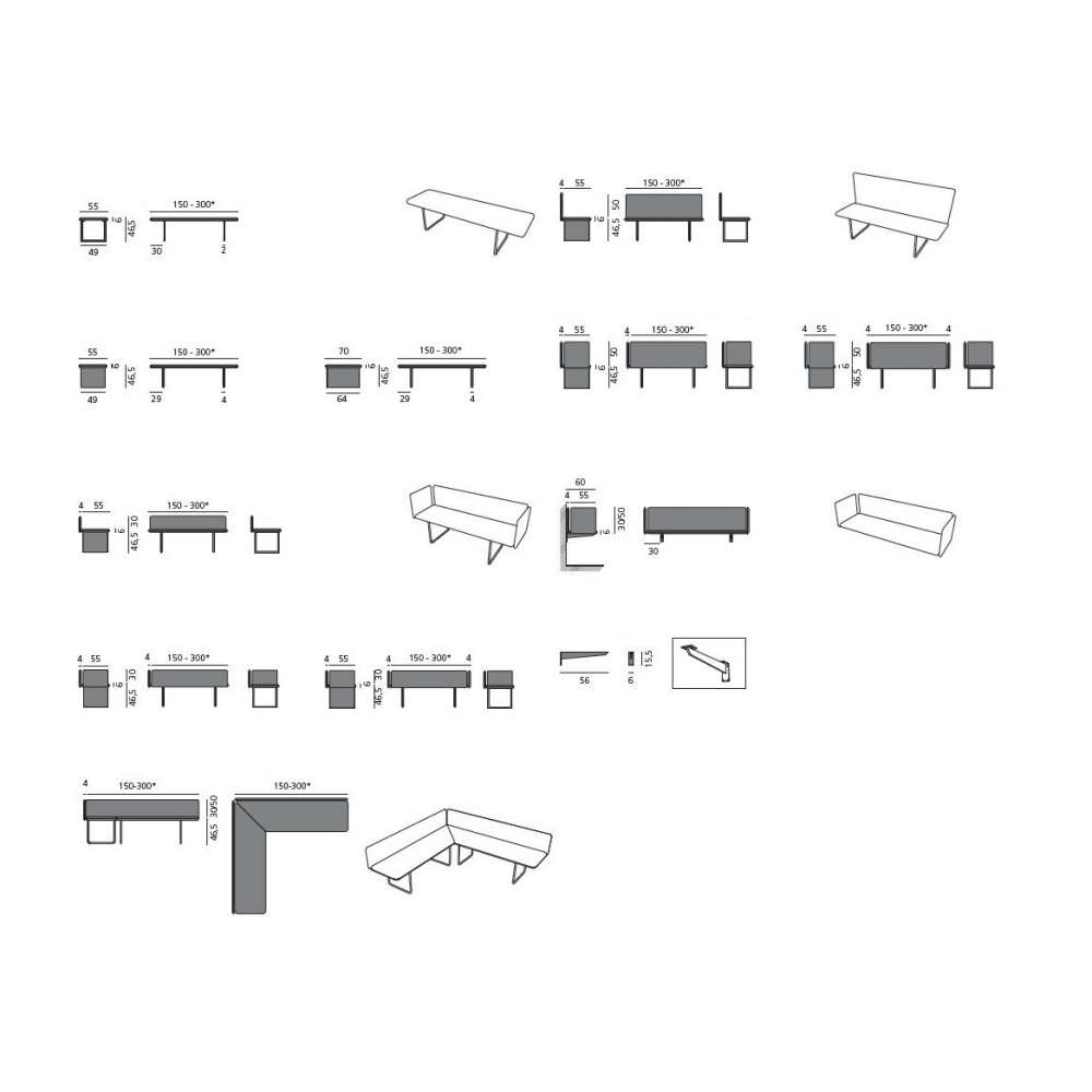 Opcje: Z oparciami siedzeń lub bez w dwóch wersjach, opcjonalnie dostępne z podłokietnikiem, na pokrowiec dostępne różne rodzaje tkanin i skór. Możliwe rozmiary pośrednie.