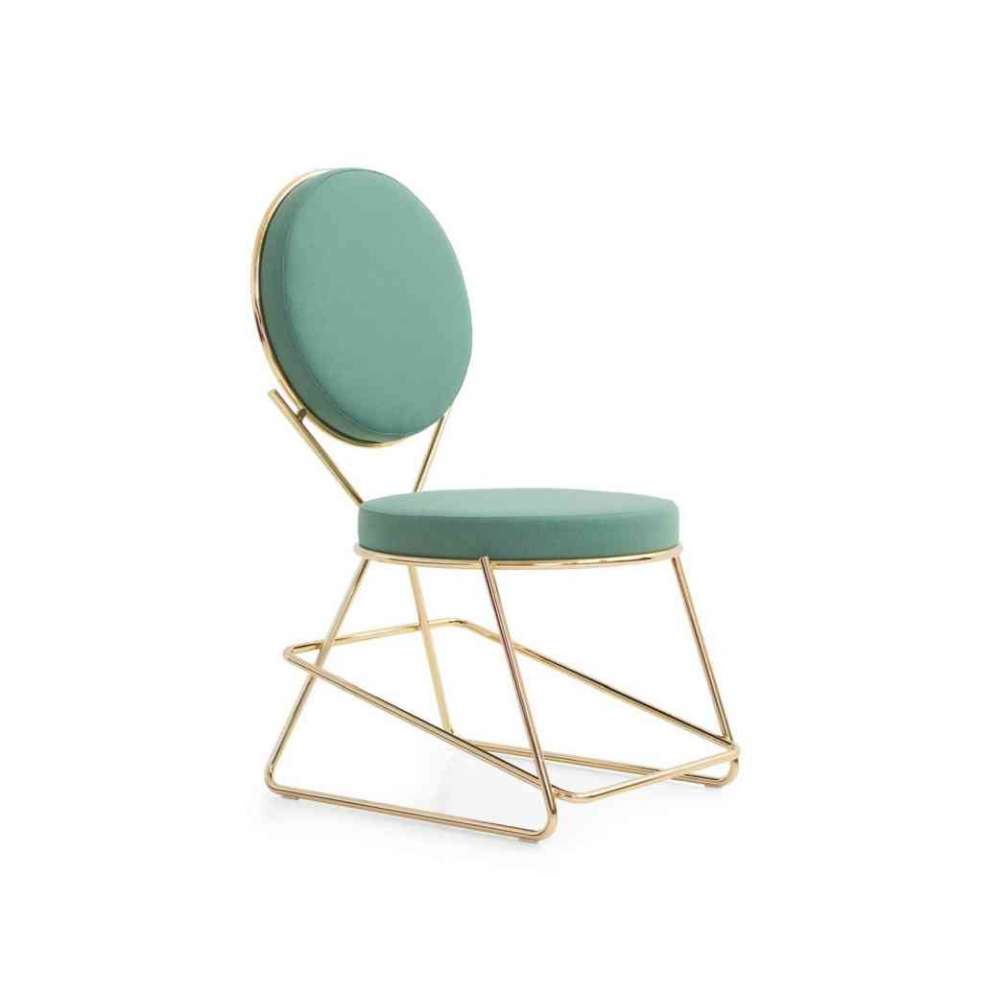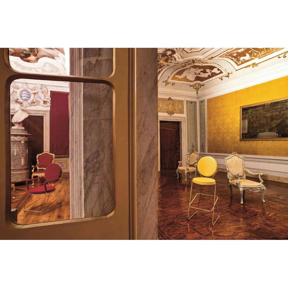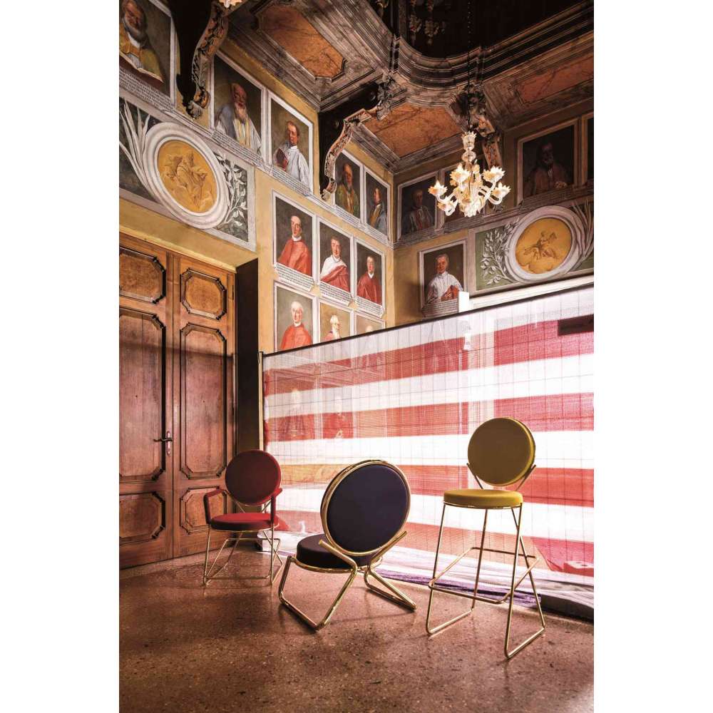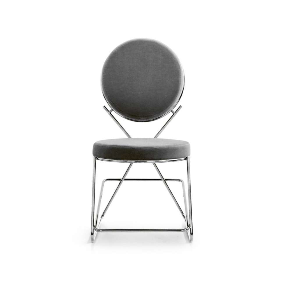 Dwa koła, dwa elementarne moduły wszczepione w geometrię konstrukcyjną inspirowaną art deco, otwarcie komunikują tendencję do maksymalne uproszczenie formalne. Jest to preludium do najwyższej jakości produkcji przemysłowej, eleganckiej oszczędności objętości wyrażonej przez możliwość, jaką daje chromowana stalowa rama, aby stworzyć z projektu kompletną rodzinę siedzisk. W ten sposób rodzi się krzesło i stołek, z podłokietnikami i bez, z dodatkiem małej dwuosobowej sofy, wyrafinowana ewolucja formalna podyktowana dobrym gustem i klasą. To powrót do porządku, przejście do języka jednocześnie luksusowego i syntetycznego.