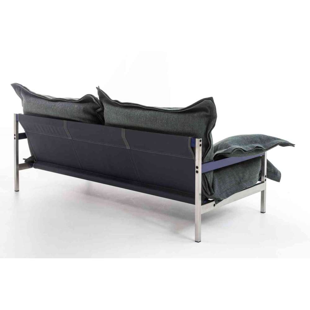 Łącząc ramę ze szczotkowanej stali nierdzewnej z organicznym kontrastem poduszek z naturalnego włókna z lnu lub konopi, twarde linie stylów biurowych spotykają się z głęboką miękkością super wygodnej sofy. Elegancka rama, malowana proszkowo w kolorze głębokiego metalicznego niebieskiego lub różowego piasku z czarnymi kontrastowymi śrubami, jest połączona ze strukturalną siateczką w dopasowanych odcieniach.