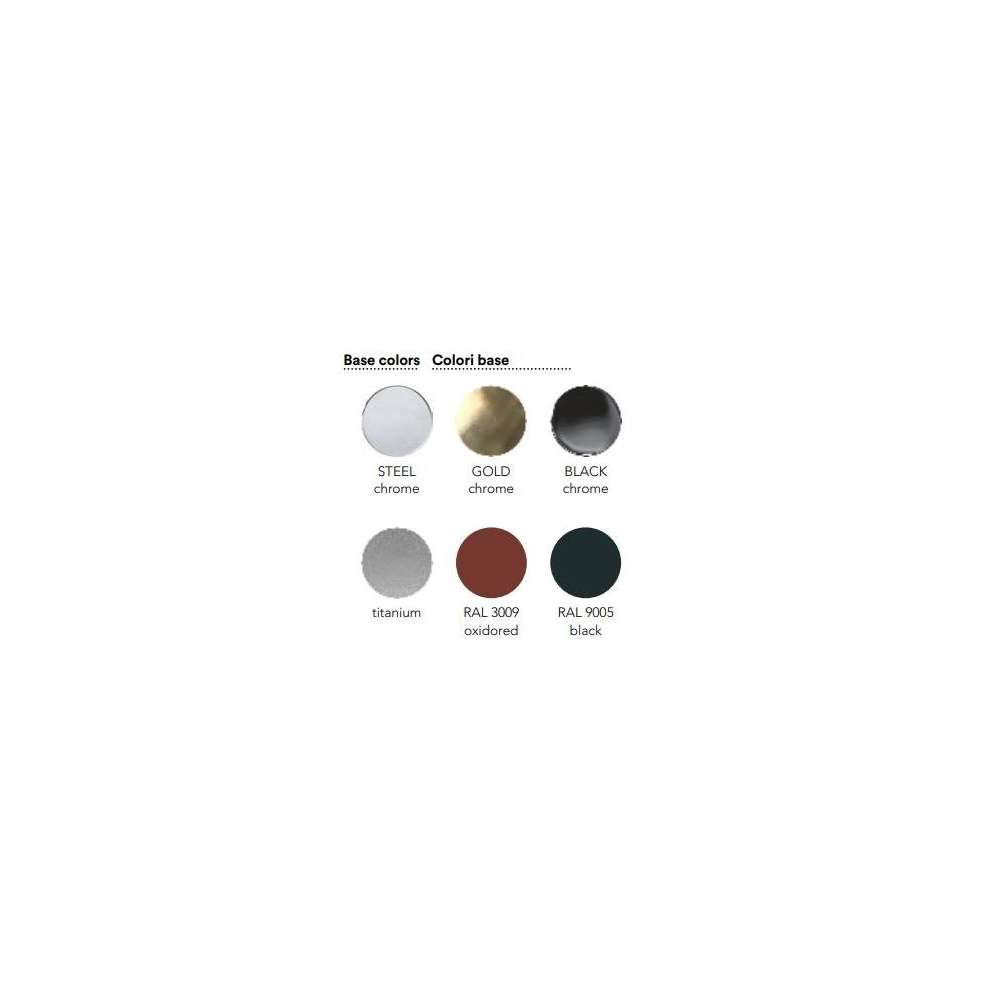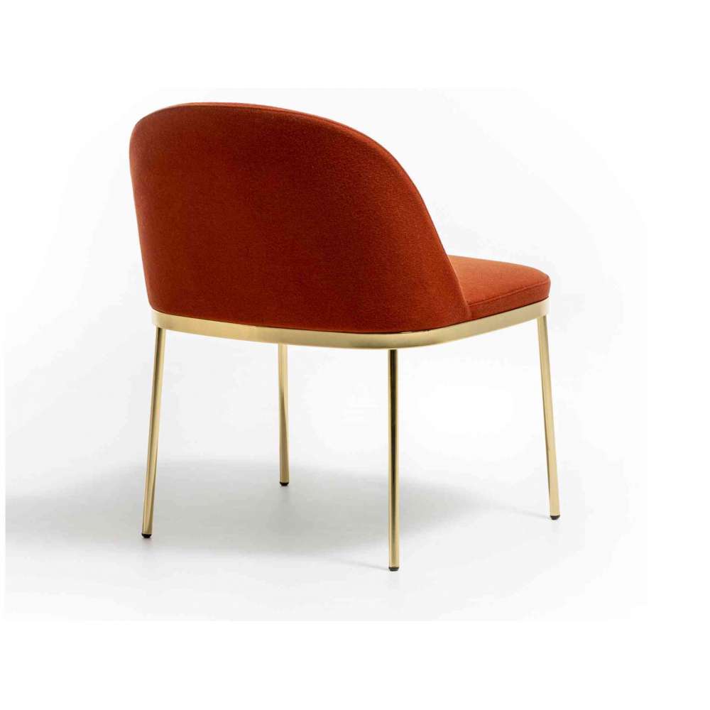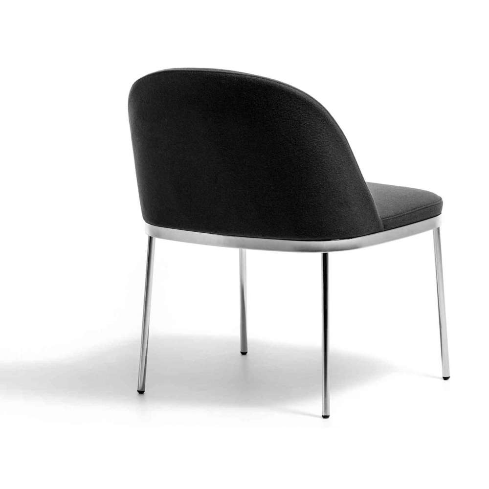 Nogi foteli są niezwykle smukłe, a chromowane lub malowana stalowa płyta stanowiąca podstawę siedziska o minimalistycznym wyglądzie nawiązującym do kształtu cienkiego pierścionka lub obrączki.
