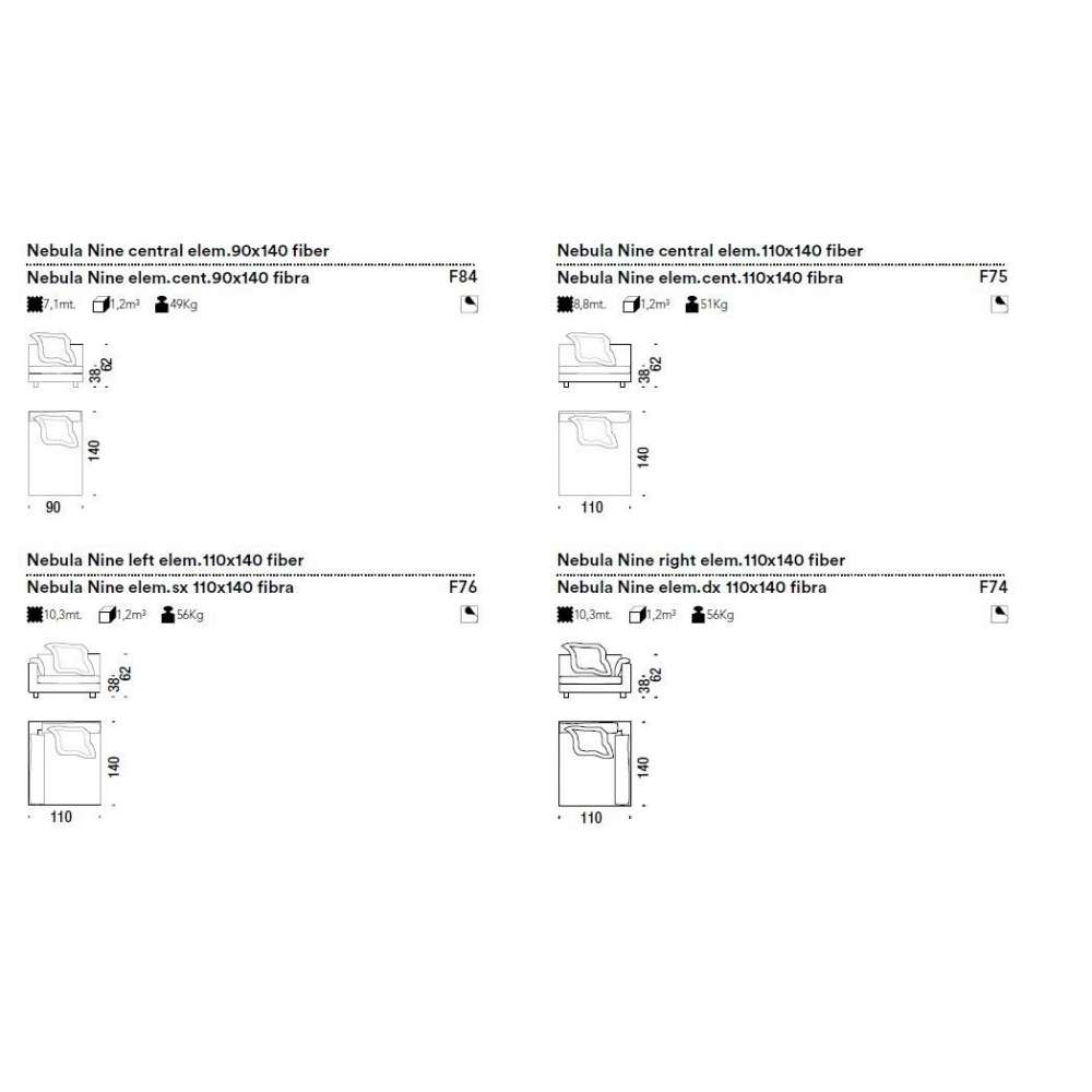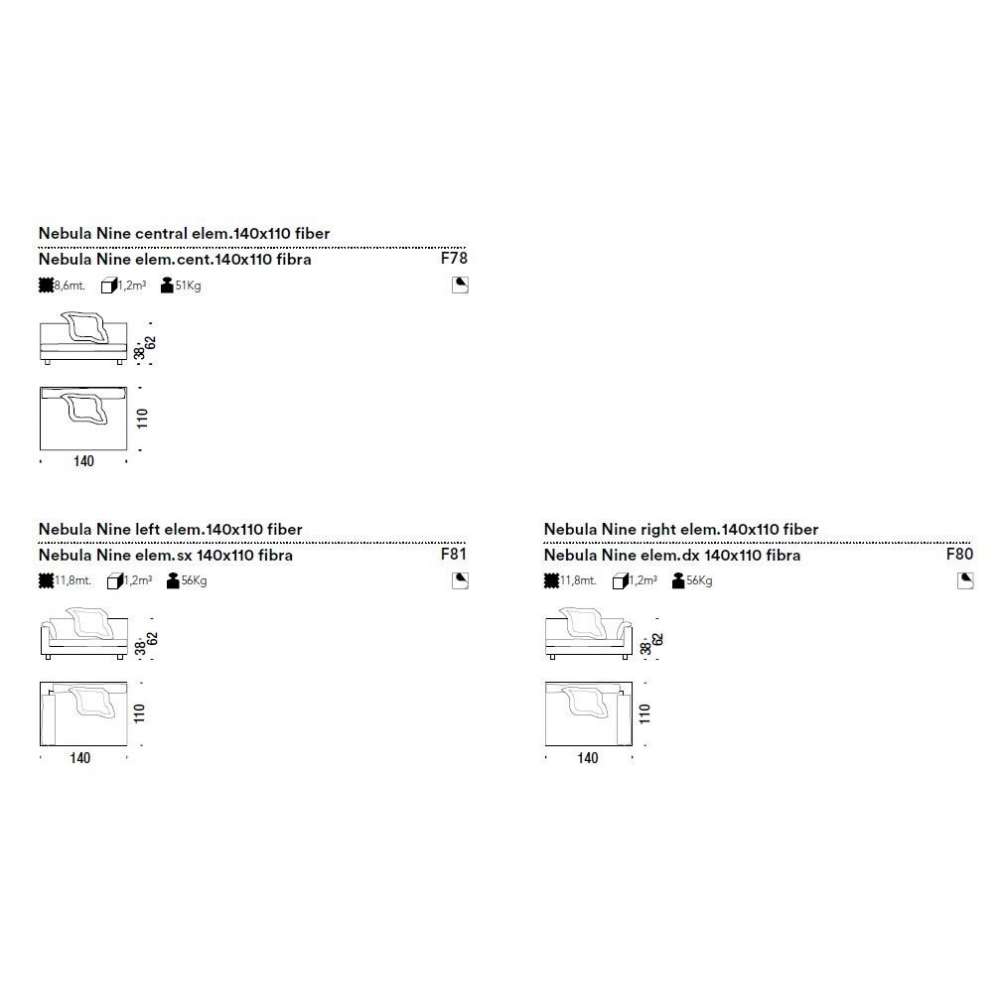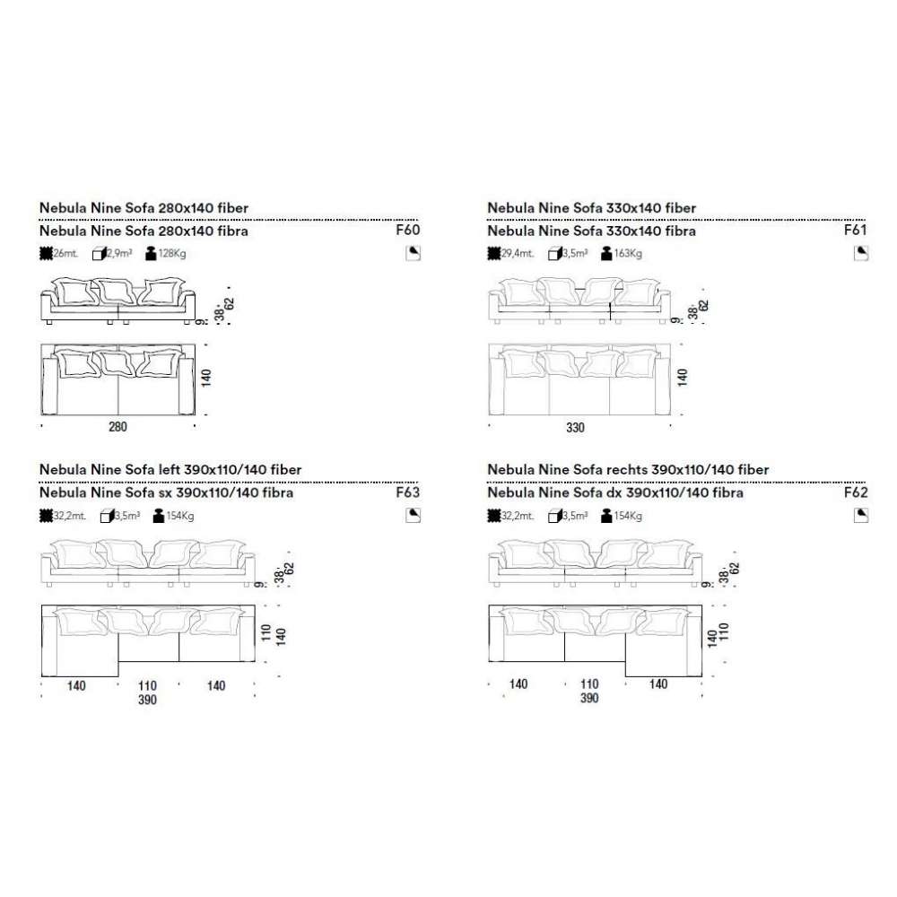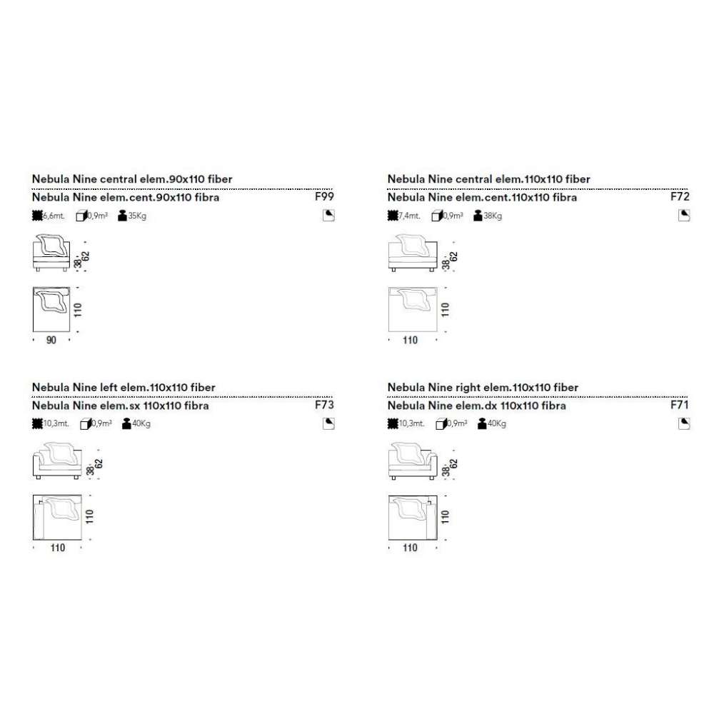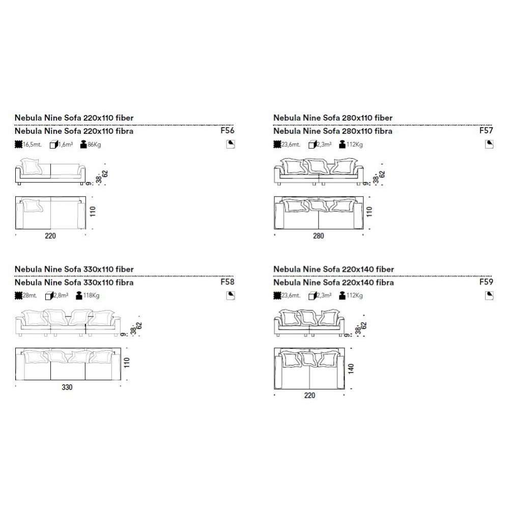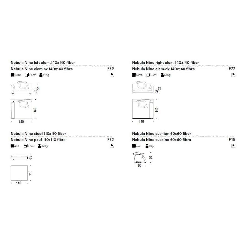 Elementy z odpornej na naprężenia pianki poliuretanowej o różnej gęstości i włókna poliestrowego na drewnianej ramie. Stopki są przykręcone do konstrukcji z jesionu. Poduszki siedziska to pianka poliuretanowa i włókno poliestrowe lub z gęsiego puchu. Nebula Nine ma zdejmowane pokrowce.