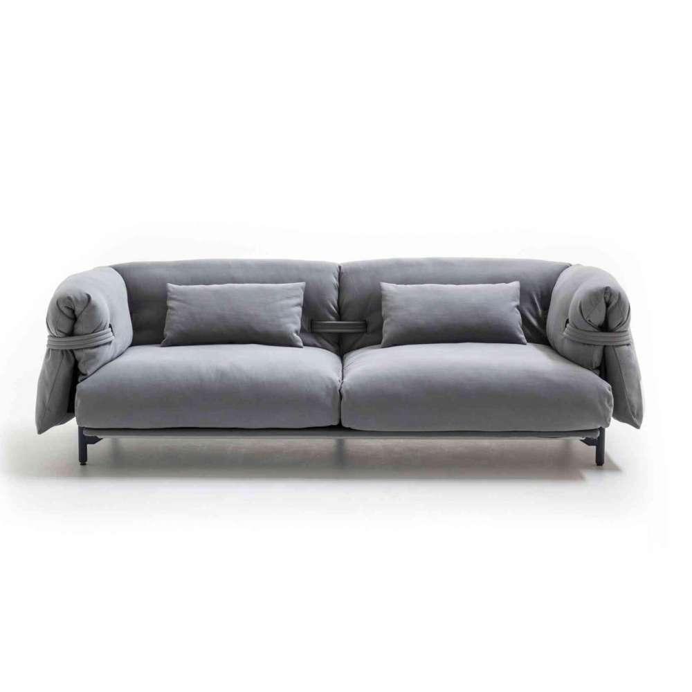 Komfort i miękkość ponad wszystko. Sofa typu open source, wybór projektu, który sprzyja wygodzie siedzenia, które ma wyglądać i czuć się bardziej miękko i przytulniej niż kiedykolwiek. Strukturę otaczają dzianinowe pasy, które przeplatają się z miękkimi poduszkami, wprowadzając w stan czystego relaksu. Złożone pokrycie podkreśla beztroski, nieokreślony kształt, dodatkowo podkreślony przez zastosowanie dzianiny na paski, które ją utrzymują. Zdestrukturyzowana sofa o nietypowej konstrukcji: aluminiowa rama może być dowolnie montowana, łącząc różne elementy, które współpracują ze sobą, oferując różnorodne harmonijne dostosowania.
