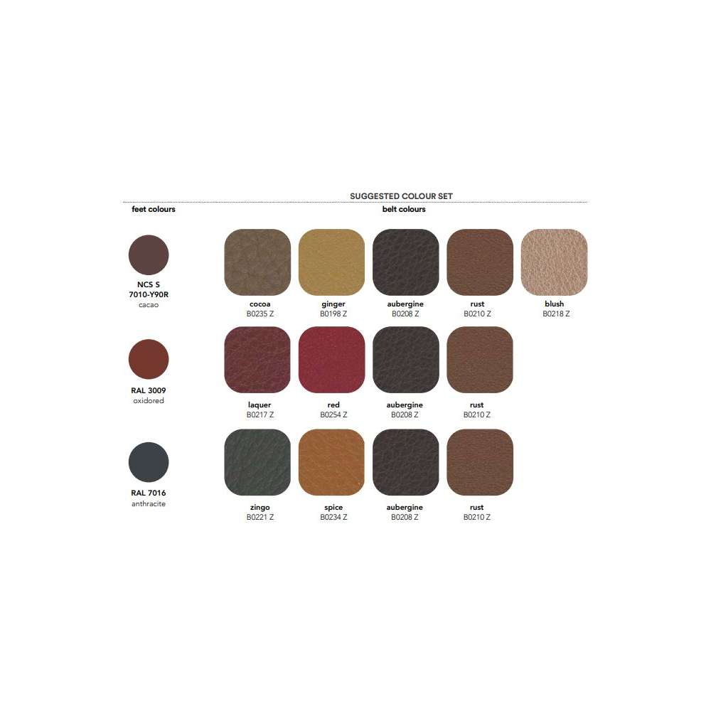 Ognioodporna pianka poliuretanowa, wypełnienie z włókna poliestrowego i pamięć wióry piankowe na wytłaczanej ramie aluminiowej. Stopki z odlewanego ciśnieniowo aluminium z wykończeniem proszkowym. Tylko pokrowce z tkaniny, paski ze skóry. Pokrywy kolekcji pasów są zdejmowane.