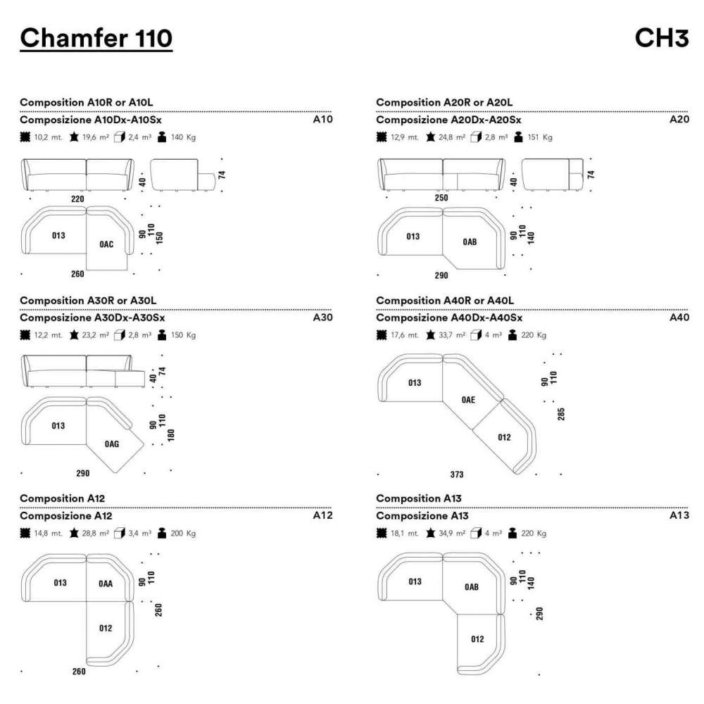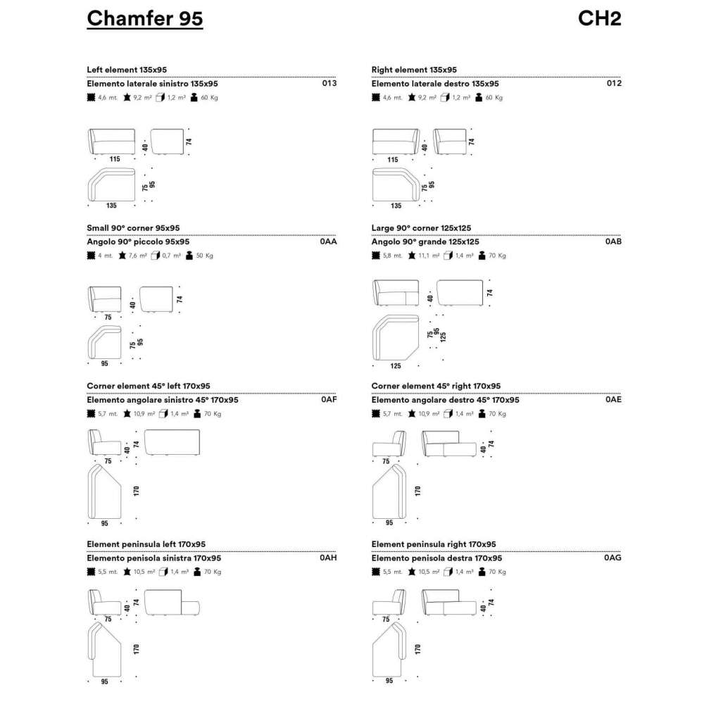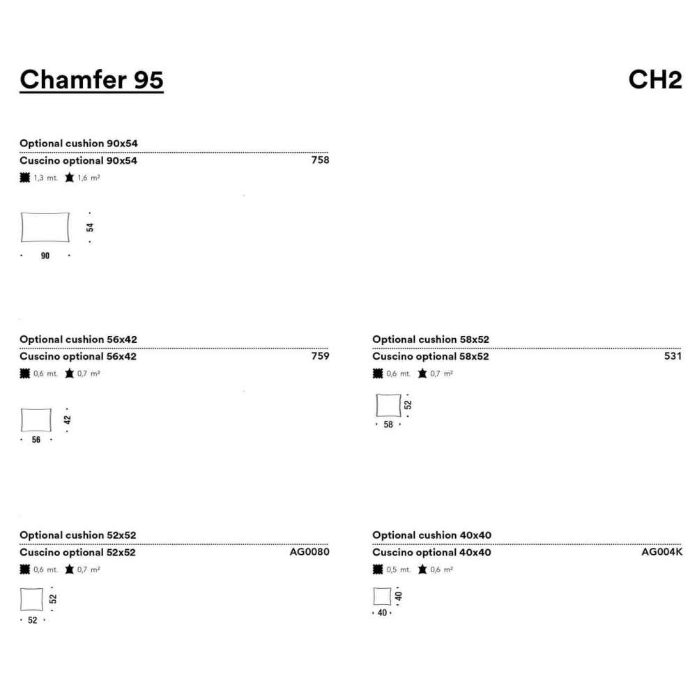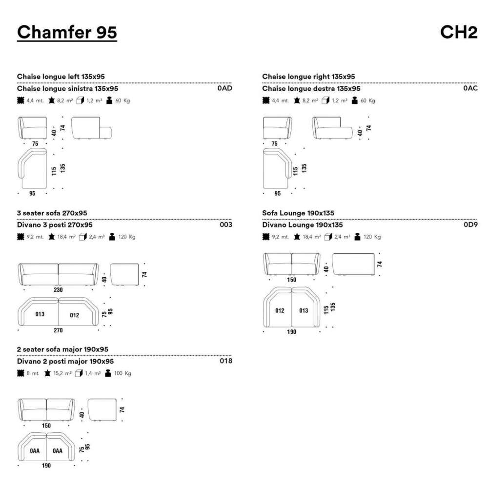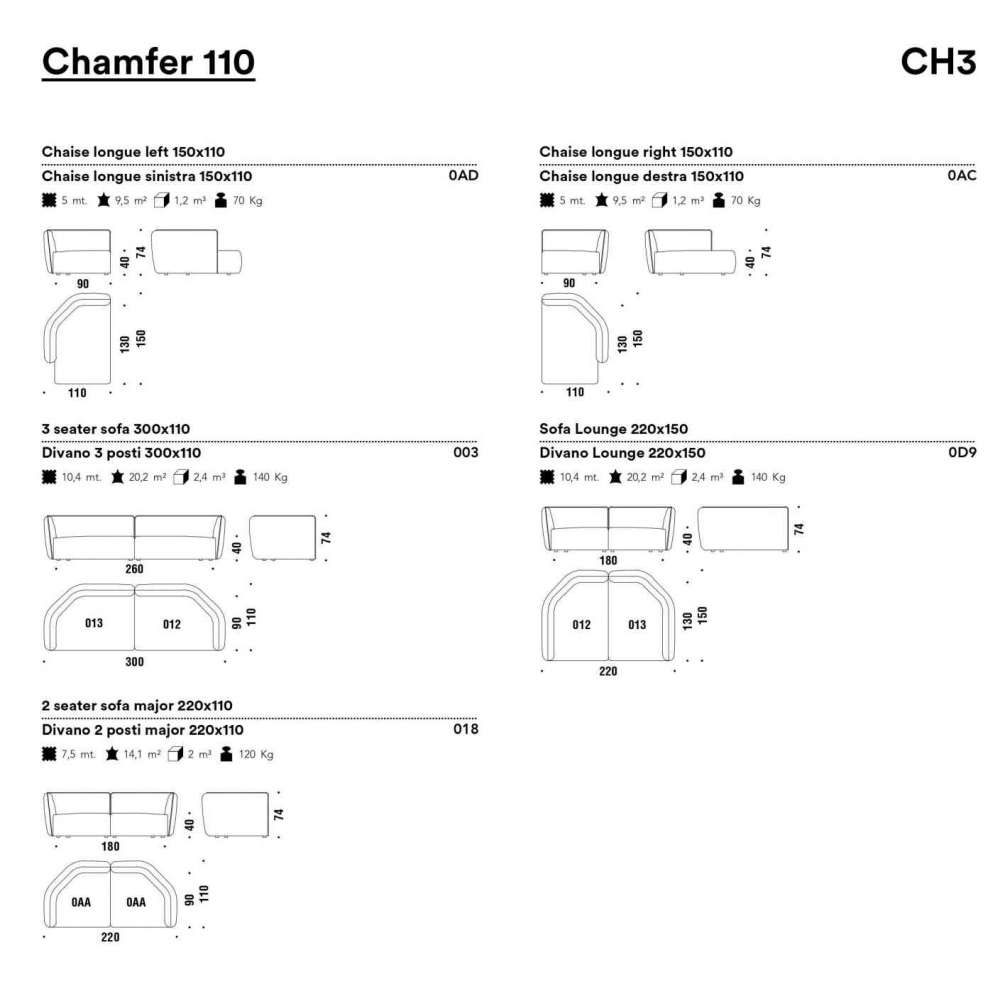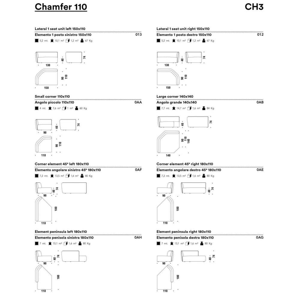 Odporna na stres pianka poliuretanowa i wtryskiwana, ognioodporna pianka poliuretanowa o różnej gęstości oraz włókna poliestrowe na drewnianej ramie. Nóżki są przykręcone do konstrukcji z czarnego polipropylenu. Opcjonalne poduszki to pianka poliuretanowa z włóknem poliestrowym i pianką z pamięcią kształtu. Wszystkie kompozycje zawierają elementy łączące ze stali ABS. Osłony kolekcji Chamfer 1 są zdejmowane.