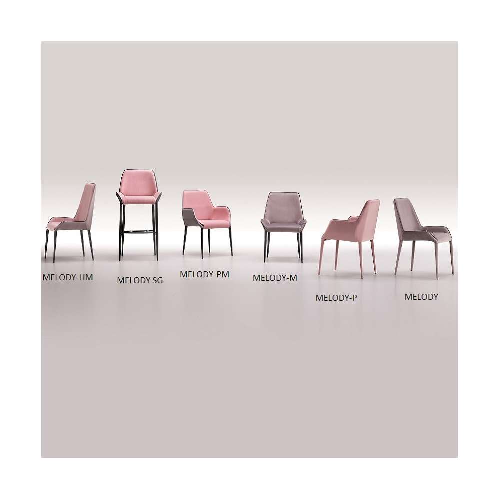 Krzesło jak gniazdo, które jest przytulne i ochronne. Melody jest niezwykle wygodna: siedzisko i oparcie są przedłużone o części, które są wyprofilowane i pochylone do przodu, aby zapewnić komfort siedzącym w nim osobom. Dostępne są cztery modele: krzesło standardowe i z wysokim oparciem, mały fotel i stołek.