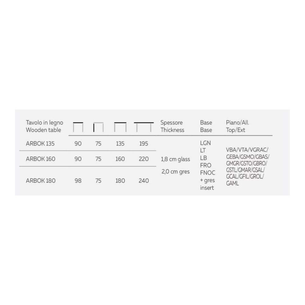 Charakterystycznym elementem rozkładanego stołu Arbok jest szczególny kształt nogi, ozdobionej na życzenie wkładką z kamionki. Rama z drewna bukowego lub jesionowego (w razie potrzeby z kamionką) podtrzymuje blat, który można wybrać ze szkła trawionego lub ceramiki. Skrzydło, które wystaje z góry i obraca się, dopóki nie zostanie prawidłowo ustawione, jest oryginalnym elementem. Rama jest z aluminium.