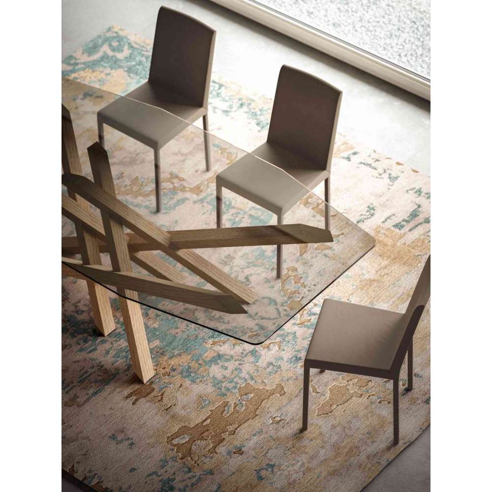 Niezwykły zarys fornirowanego blatu, dostępnego również w szkle i gresie, definiuje przyciągającą wzrok elegancję tego stołu i bez trudu łączy się z mocnym wyrazem dębowej ramy w różnych wykończeniach. Charakterystycznym elementem stołu jest specyficzny kształt stelaża, na życzenie ozdobiony wkładem kamionkowym.