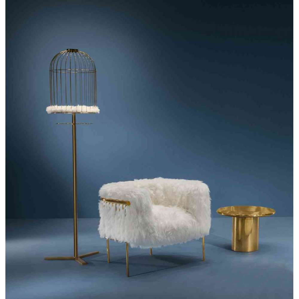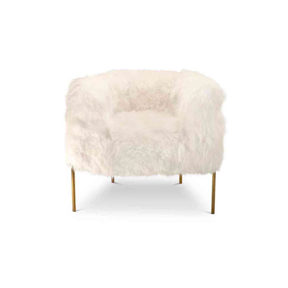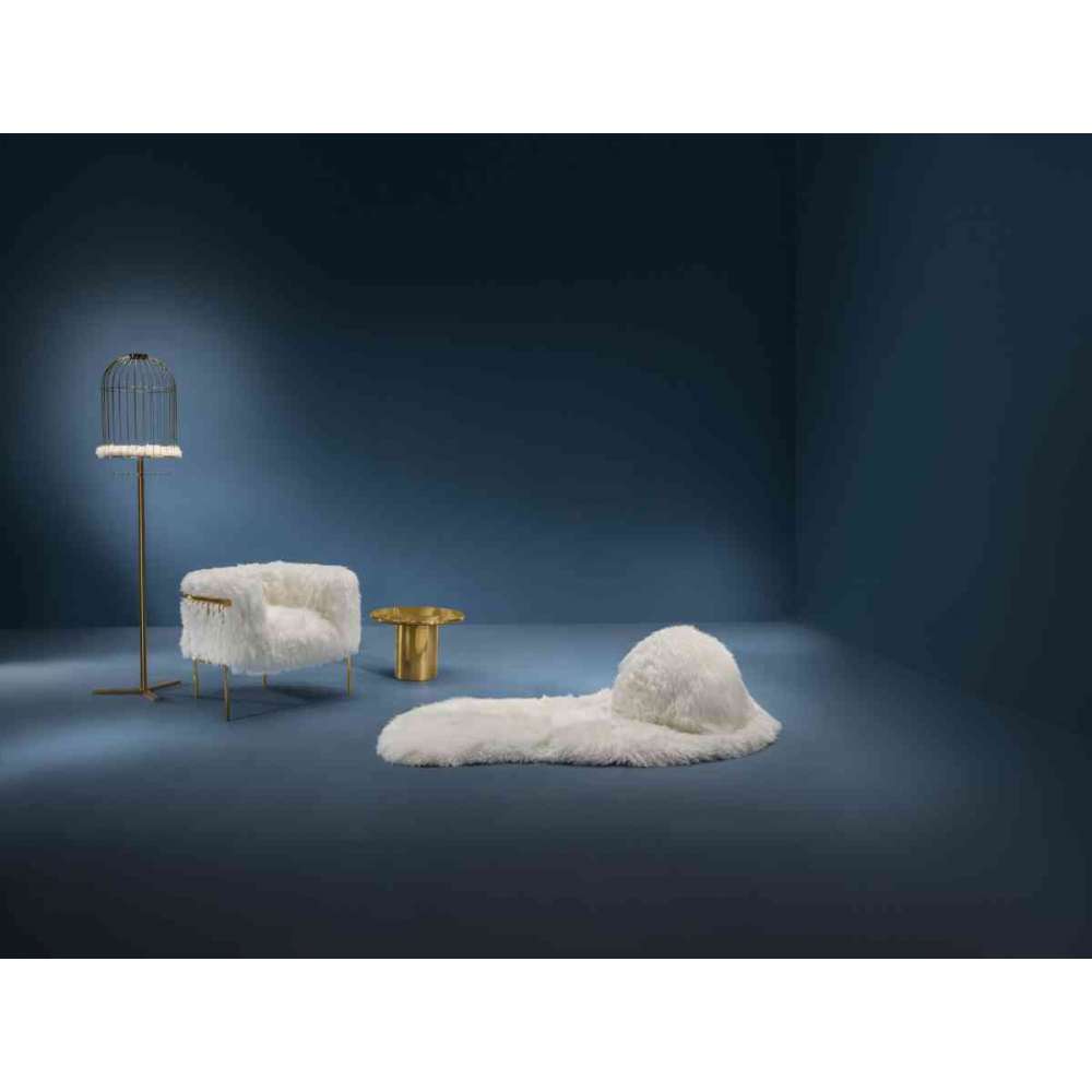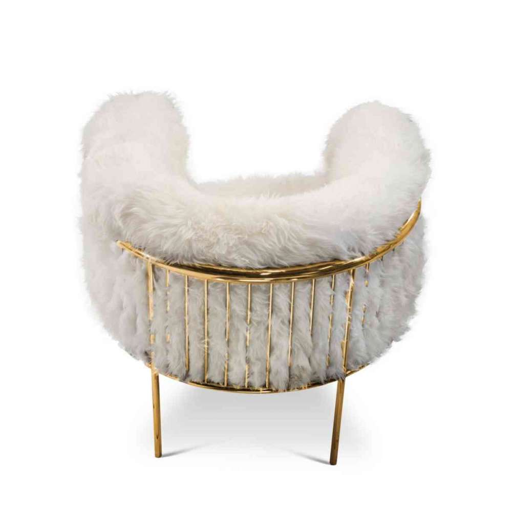 Coronum Fotel to niezwykłe siedzisko z miękką, białą tapicerką z owczej skóry w złotym metalu.