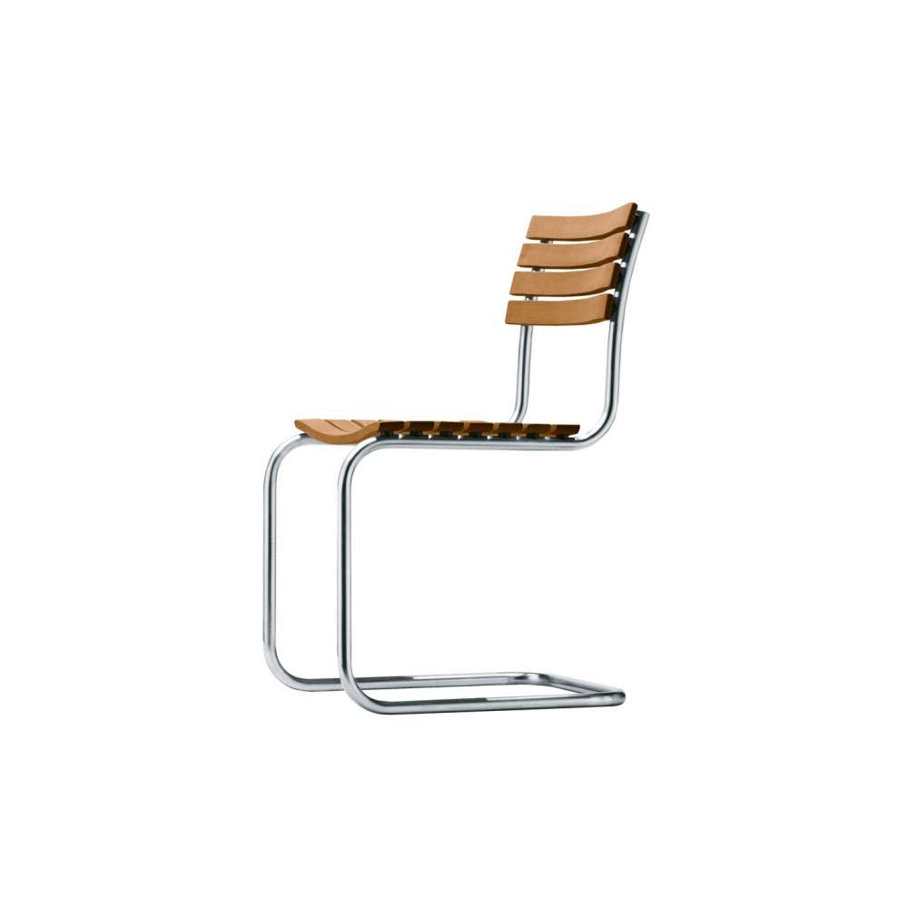 Krzesła ogrodowe, które pod względem konstrukcji i designu pasują do klasycznego S 43 by Mart Stam: przejrzyste i powściągliwe w formie, z idealnym komfortem siedzenia i wysoką jakością materiałów i obróbki. Pod nazwą modelu B 33 g (g = ogród) krzesła te zostały po raz pierwszy zaprezentowane w katalogu Thonet z 1935 roku. Obecnie drewniane listwy są wykonane z litego Iroko, afrykańskiego drewna o wysokiej gęstości i odporności na warunki atmosferyczne (uszczelnienie FSC). Wyglądem przypomina drewno tekowe i ma gładką, równą powierzchnię. Wszystkie drewniane części są naoliwione dla ochrony. Stół S 1040 pasuje do tych krzeseł.
