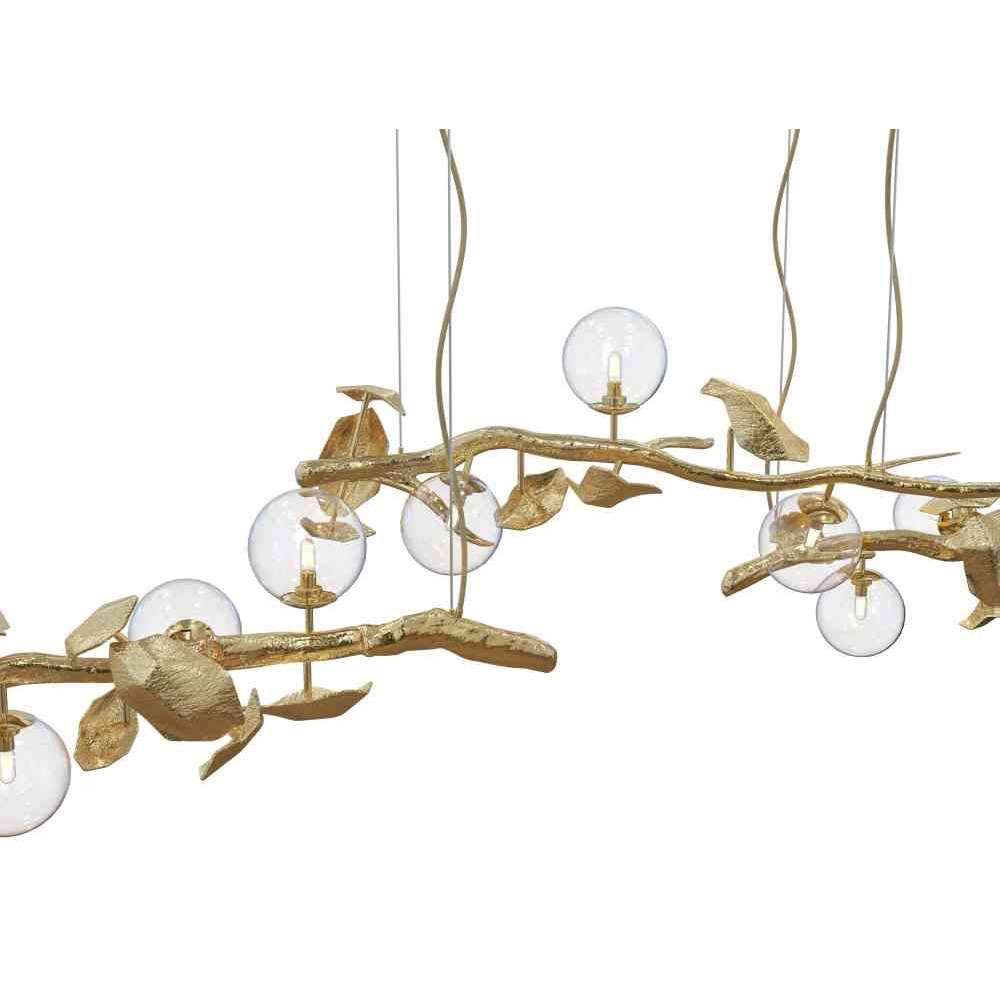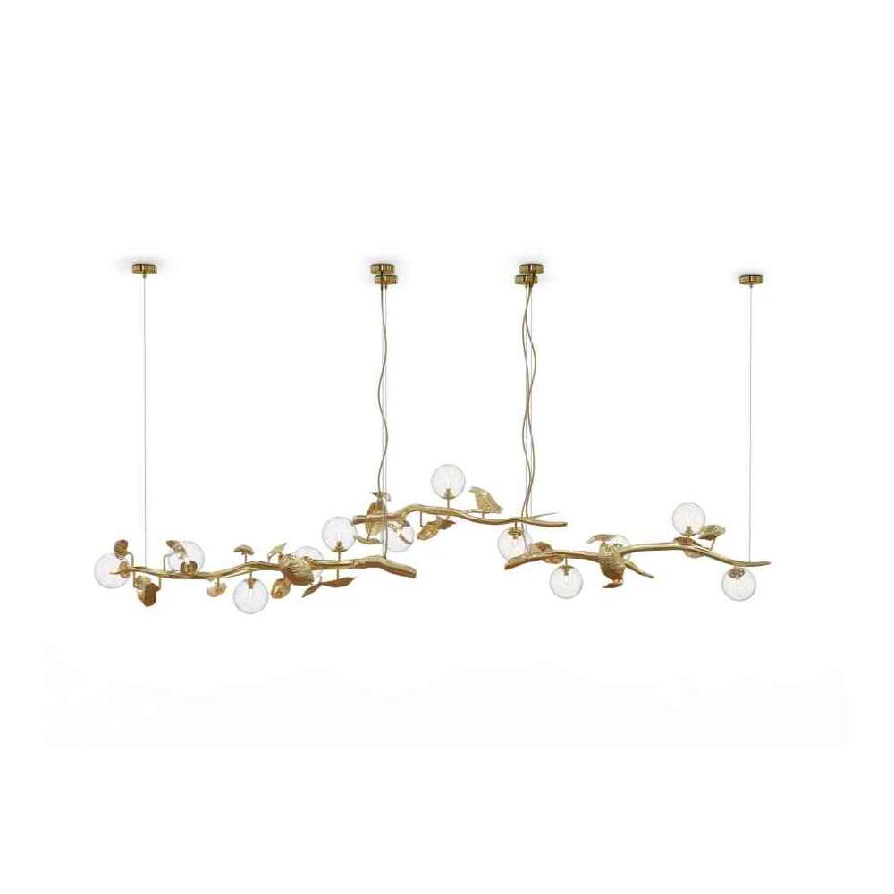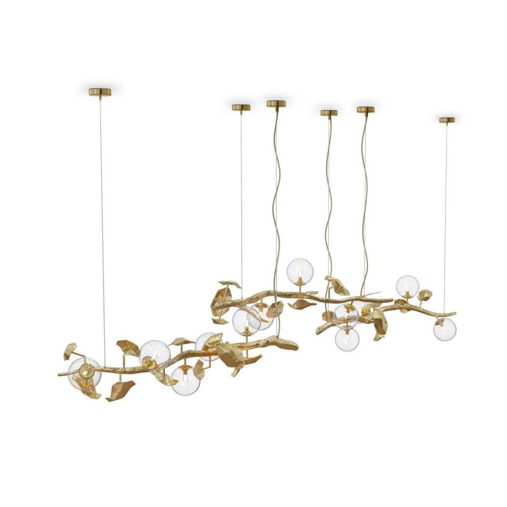Oprawa oświetleniowa jest uformowana tak, aby przypominała cechy i wygląd złotej gałęzi. Ten żyrandol, wykonany ręcznie z odlewanego mosiądzu, ma organiczny kształt i misterne współczesne detale, aby stworzyć regulowaną aranżację w harmonijnym zespole. Nadaje się do wytwornych salonów i jadalni.