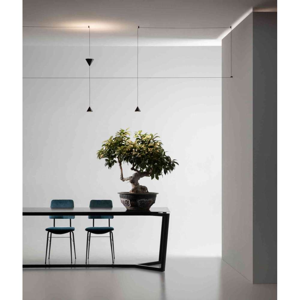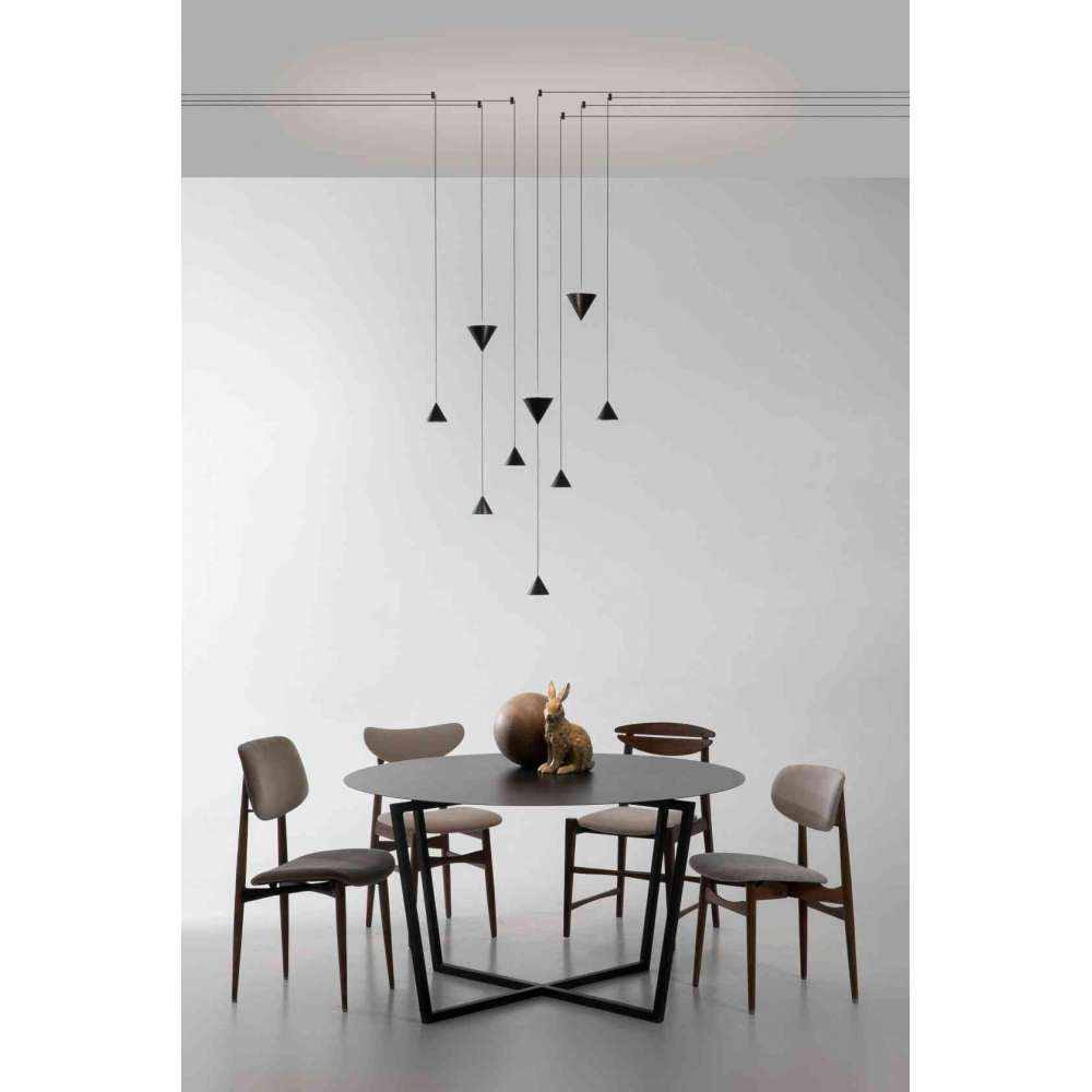 Podstawowym elementem systemu zawieszenia Filomena jest prosty czarny aluminiowy stożek. System rozgałęzia się od tego podstawowego elementu w kierunku sufitów i ścian i może być zawieszony na różnych wysokościach za pomocą długiego, cienkiego kabla, co pozwala na wyrafinowane akrobacje. Na kablu można zainstalować dwa stożki. Mniejszy stożek kieruje światło w dół, podczas gdy większy stożek kieruje światło w górę. Stożki można rozstawiać i podwieszać do sufitu lub ściany za pomocą specjalnych aluminiowych odchylaczy w kolorze czarnym. Zasilacz można postawić na podłodze, wpuścić w ścianę lub schować pod białą tynkową rozetą sufitową z motywem kwiatowym. Materiał: Czarne aluminium Źródło światła: góra LED 24V 16,8W + dół LED 24V 8,4WOdbiorca: :