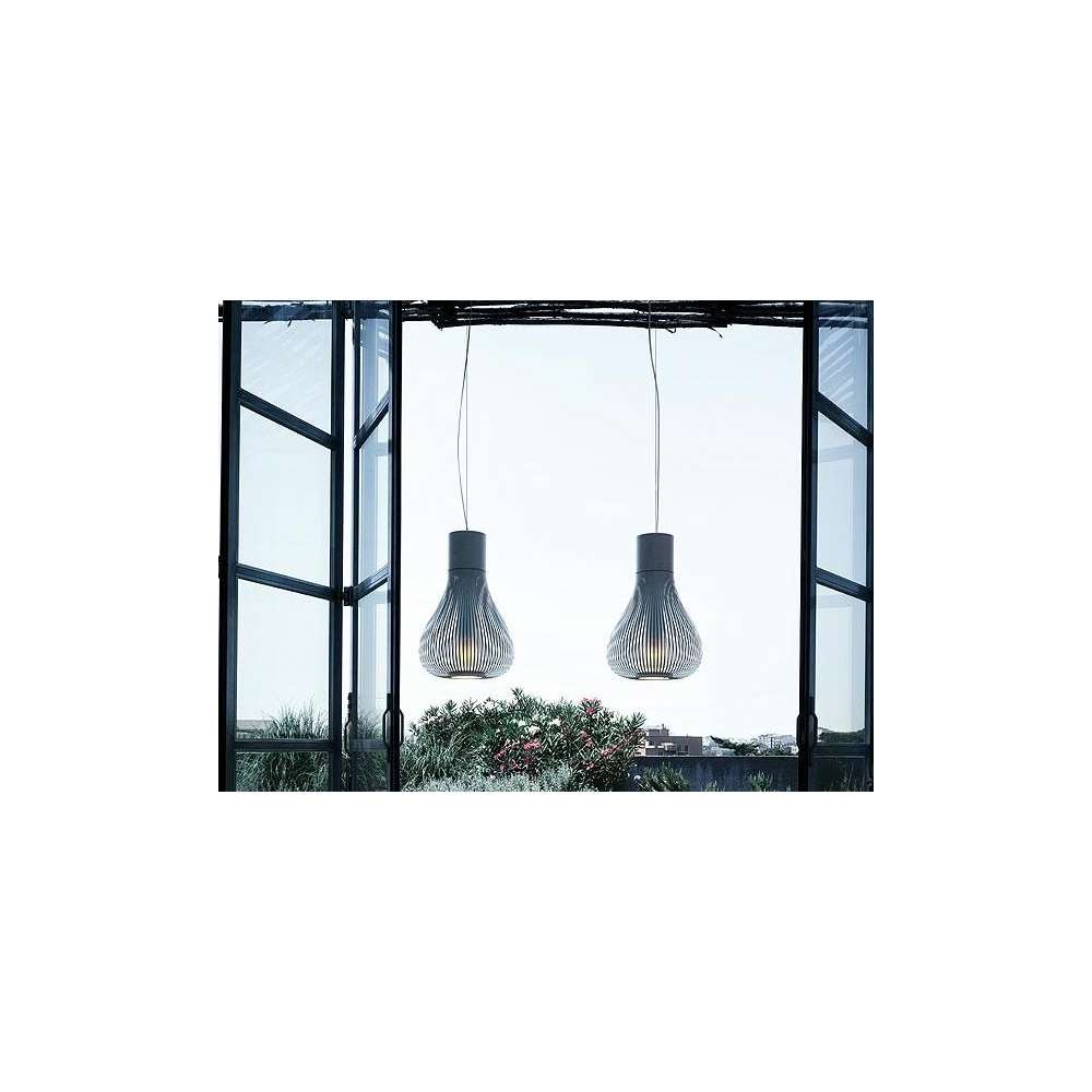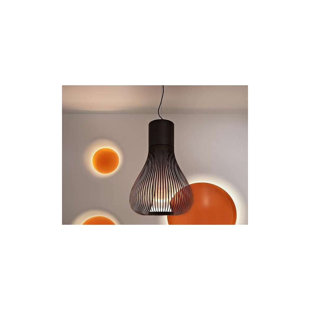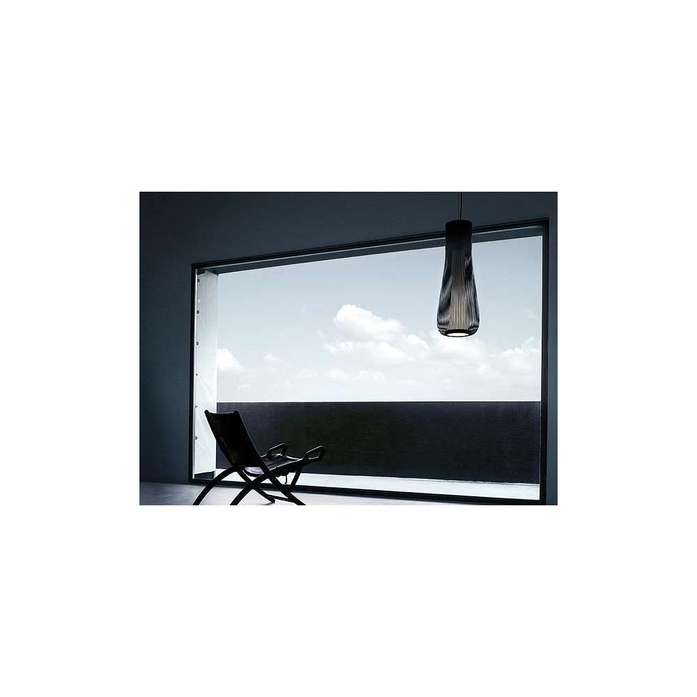 Lampa wisząca zapewniająca oświetlenie rozproszone Korpus ze stali nierdzewnej fototrawionej chemicznie i dyfuzor borokrzemianowy Płynna ochrona lakieru Podstawa z odlewanego ciśnieniowo aluminium, rozeta sufitowa z 30% wzmocnionego włóknem szklanym z poliamidu, przymocowana do tłoczonej i ocynkowanej stalowej oprawy sufitowej W tej wersji emisja światła może być regulowana za pomocą ruchu mechanicznego, który otwiera lamele, zmieniając w ten sposób kształt oprawy Stalowy zwieszak, przewód zasilający FEP/PVC w kolorze oprawy.