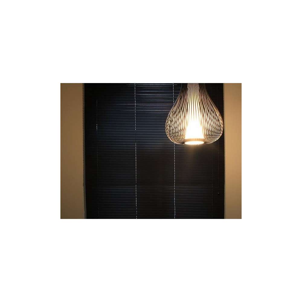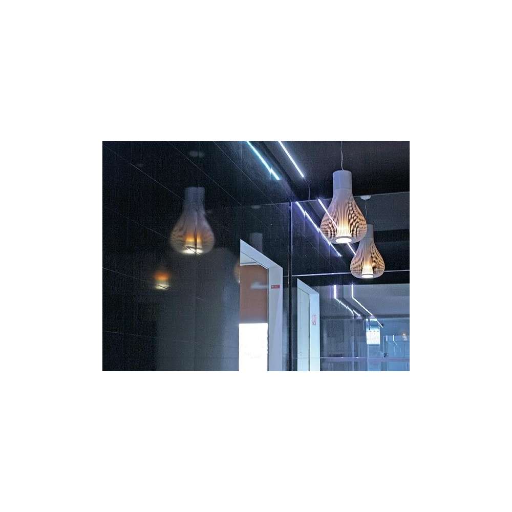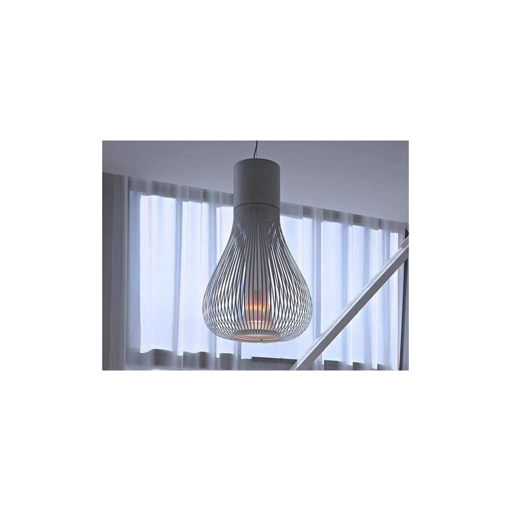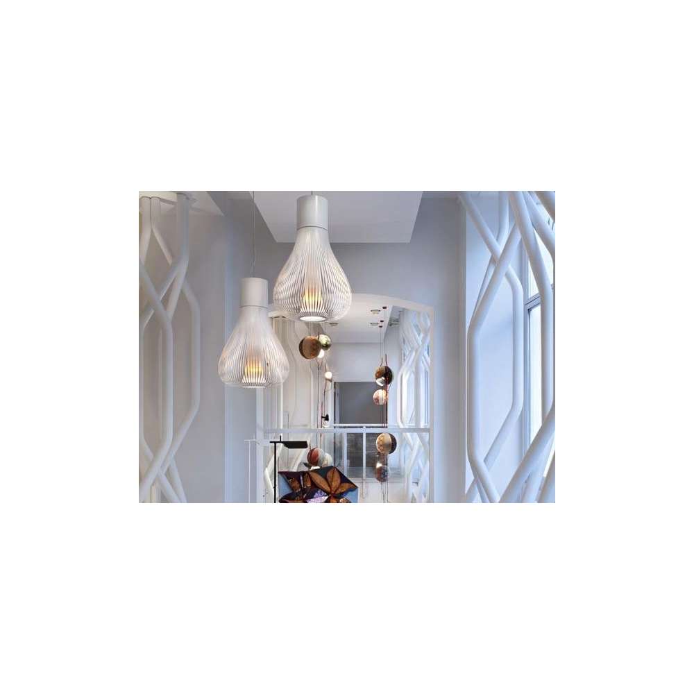 Lampa wisząca zapewniająca oświetlenie rozproszone Korpus ze stali nierdzewnej fototrawionej chemicznie i dyfuzor borokrzemianowy Płynna ochrona lakieru Podstawa z odlewanego ciśnieniowo aluminium, rozeta sufitowa z 30% wzmocnionego włóknem szklanym z poliamidu, przymocowana do tłoczonej i ocynkowanej stalowej oprawy sufitowej W tej wersji emisja światła może być regulowana za pomocą ruchu mechanicznego, który otwiera lamele, zmieniając w ten sposób kształt oprawy Stalowy zwieszak, przewód zasilający FEP/PVC w kolorze oprawy.