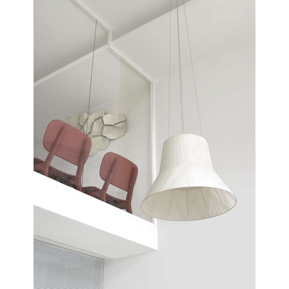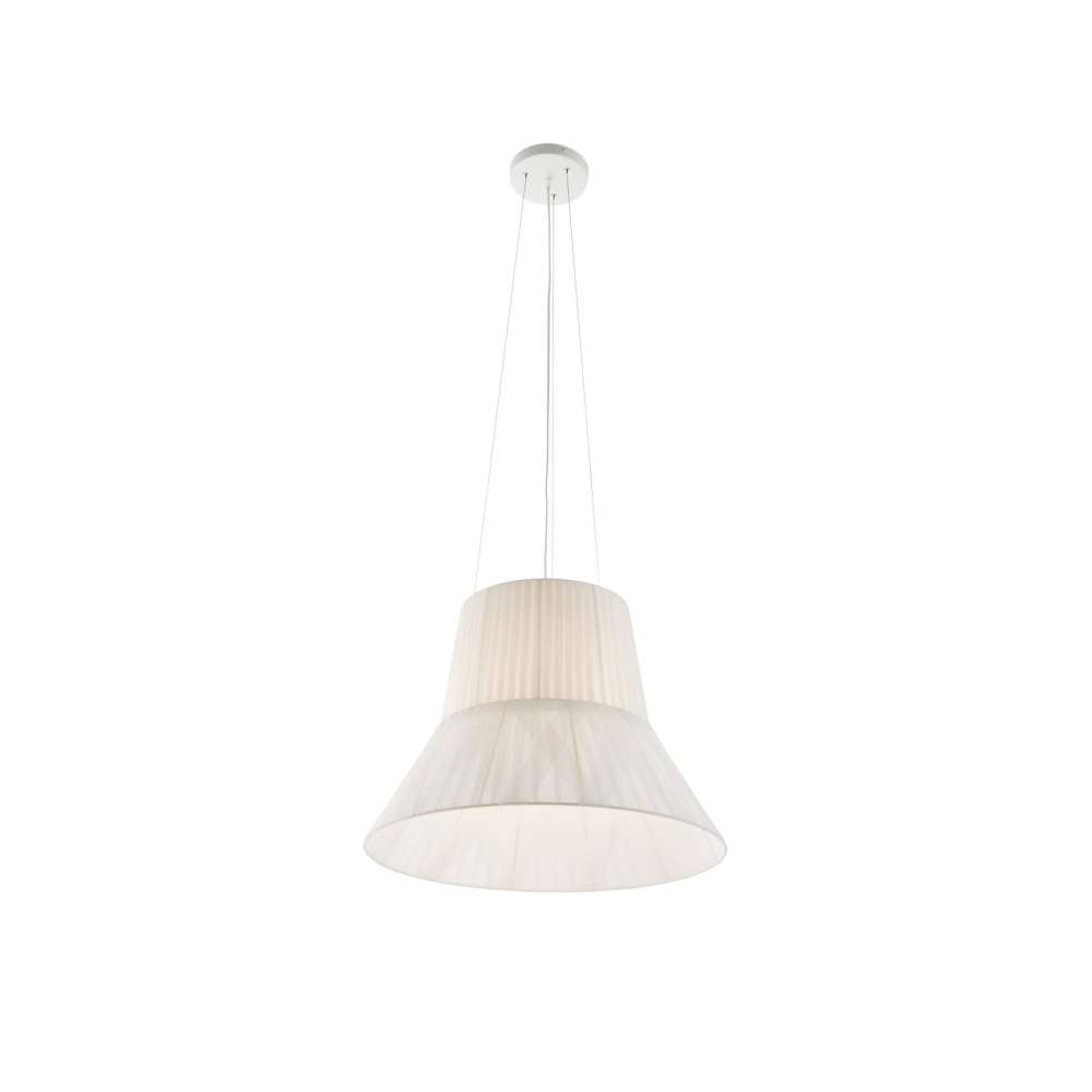 LAMPA SUFITOWA PODWIESZANA SPRZEDAWANA JEST Z ŻARÓWKĄ KLASY ENERGETYCZNEJ A. PASUJE DO ŻARÓWEK Z KLAS ENERGETYCZNYCH A++ DO E. Shade (H 43 Ø 60 cm) z plisowanej taśmy poliestrowej w kolorze szampańskim i matowego szkła. Światło zawieszone na 3 metalowych linkach (dł. 2 m), z regulacją wysokości za pomocą „coulistopu”. Kabel przezroczysty 2,50 m. Oprawa sufitowa lakierowana na biało, satynowo-epoksydowo (H 2,8 Ø 16 cm). W zestawie 1 x standardowa (klasyczna A) żarówka halogenowa eco E 27 70 W.