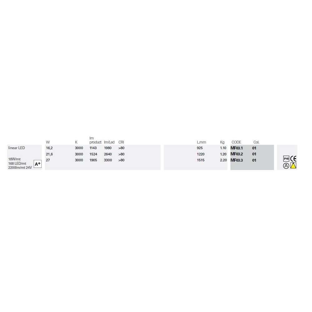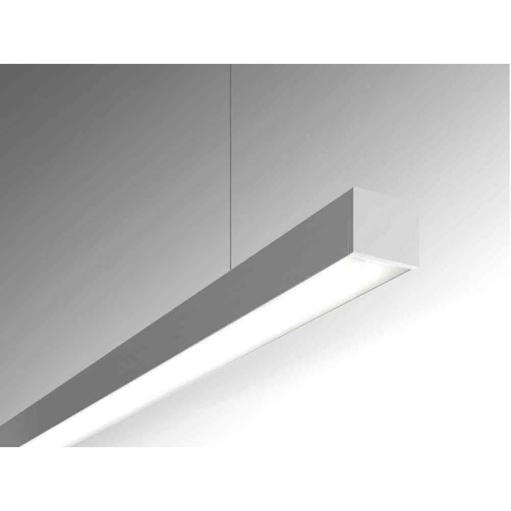 Seria opraw do montażu na suficie, wpuszczania lub wpuszczania bez przycięcia na płaskich powierzchniach lub do wbudowania bez przycięcia pod kątem zewnętrznym i wewnętrznym. Bezpośrednia rozproszona emisja światła. Liniowe źródła LED, do uzupełnienia zdalnym sterownikiem 24Vdc. Korpus z wytłaczanego aluminium, lakierowany, w komplecie z mlecznobiałym kloszem z poliwęglanu. Boczne zaślepki systemu Light Proof. Stopień ochrony IP40 lub IP65.