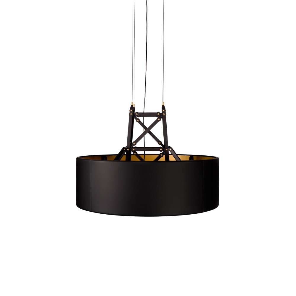Przemysłowy wygląd wiszącej lampy budowlanej, z charakterystyczną konstrukcją słupa elektrycznego, ładnie komponuje się z eleganckimi niuansami kolorów i stylowymi mosiężnymi detalami.