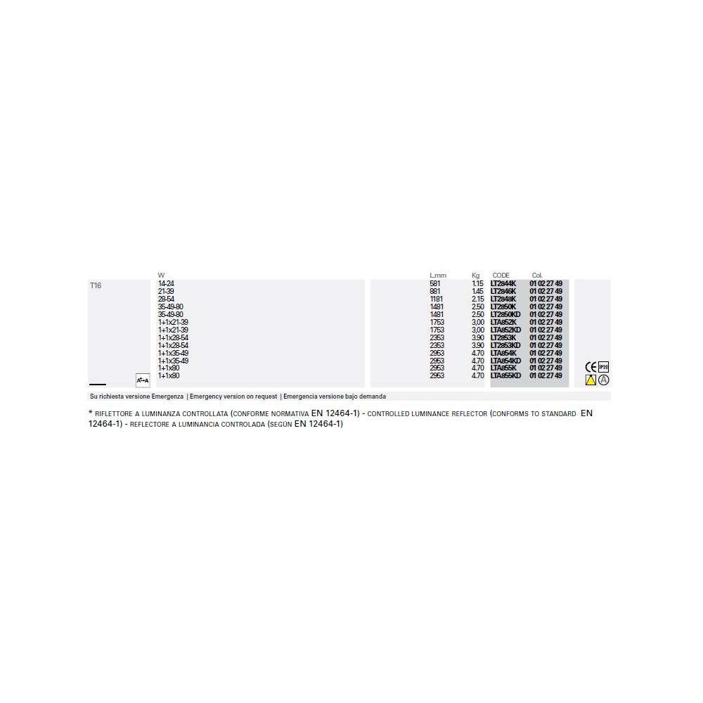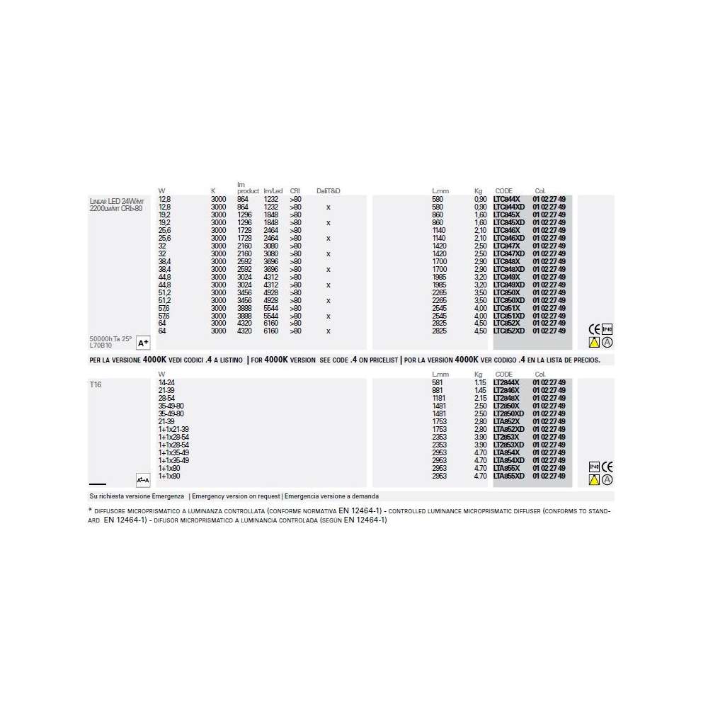 Seria opraw do wbudowania i bez przycięcia wpuszczanych, montowanych do sufitu, naściennych i wiszących do bezpośredniego rozproszonego oświetlenia. Do zintegrowanych liniowych źródeł LED lub do świetlówek T16. Zintegrowane zasilanie elektroniczne 230/240V-50/60Hz. Korpus o wymiarach 61,5x40 mm. wytłaczane aluminium. Malowane lub anodowane wykończenie. Super smukły 5 mm. szerokość krawędzi wykończenia. W komplecie z uchwytami do mocowania do sufitu podwieszanego/ściany, z systemem śrub mikroregulacyjnych, bocznymi zaślepkami i mlecznobiałym lub mikropryzmatycznym (zgodnym z dyrektywą UE EN 12464-1) kloszem z poliwęglanu lub wysokowydajną ciemno-jasną aluminiową kratką. Oprawy stają się modułami systemowymi, jeśli są instalowane w profilu Kontener (patrz rozdział Systemy). Stopień ochrony IP40/IP43. Skrzynka ścienna z wytłaczanego aluminium do montażu wpuszczanego w ścianach betonowych lub ceglanych, dostępna jako wyposażenie dodatkowe.