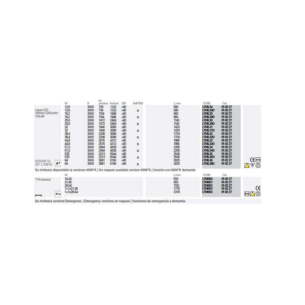 Seria opraw wpuszczanych i wpuszczanych bez przycięcia, montowanych na suficie/ścianie i wiszących do oświetlenia bezpośredniego, rozproszonego i/lub akcentującego. Do zintegrowanych liniowych źródeł LED, świetlówek bezszwowych T16 i zintegrowanych reflektorów LED. Zintegrowane zasilanie elektroniczne 230/240V 50/60Hz. Korpus o wymiarach 62x32 mm. wytłaczane aluminium. Malowane lub anodowane wykończenie. Super smukły 5 mm. szerokość krawędzi wykończenia. W komplecie ze wspornikami do montażu na suficie/ścianie, wyposażonym w system śrub mikroregulacyjnych i boczne zaślepki. Modele ze zintegrowanymi liniowymi źródłami LED i świetlówkami w komplecie z mlecznobiałym kloszem z poliwęglanu, wersje ze zintegrowanym reflektorem LED w komplecie z kilkoma aluminiowymi kształtownikami do szybkiego montażu. Stopień ochrony IP20/IP23 lub IP40/IP43 w zależności od wybranego modelu. Skrzynka ścienna z wytłaczanego aluminium do montażu wpuszczanego w ścianach betonowych lub ceglanych, dostępna jako wyposażenie dodatkowe.