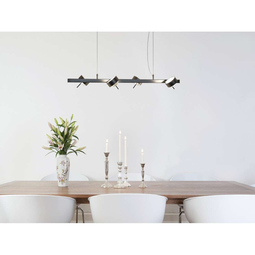 Puk Quartett & Sixtett to lampy sufitowe z wahadłem, wysokonapięciowe halogenowe, ściemniane, obrotowe głowice. Puk Ceiling Quartett (cztery głowice) i Sixtett (sześć głowic) w powierzchniach chrom, chrom mat, nikiel mat, biały, czarny i antracyt. Może być wyposażony w okulary, soczewki i filtry barwne oraz głowicę LED z serii "Puk equipment".