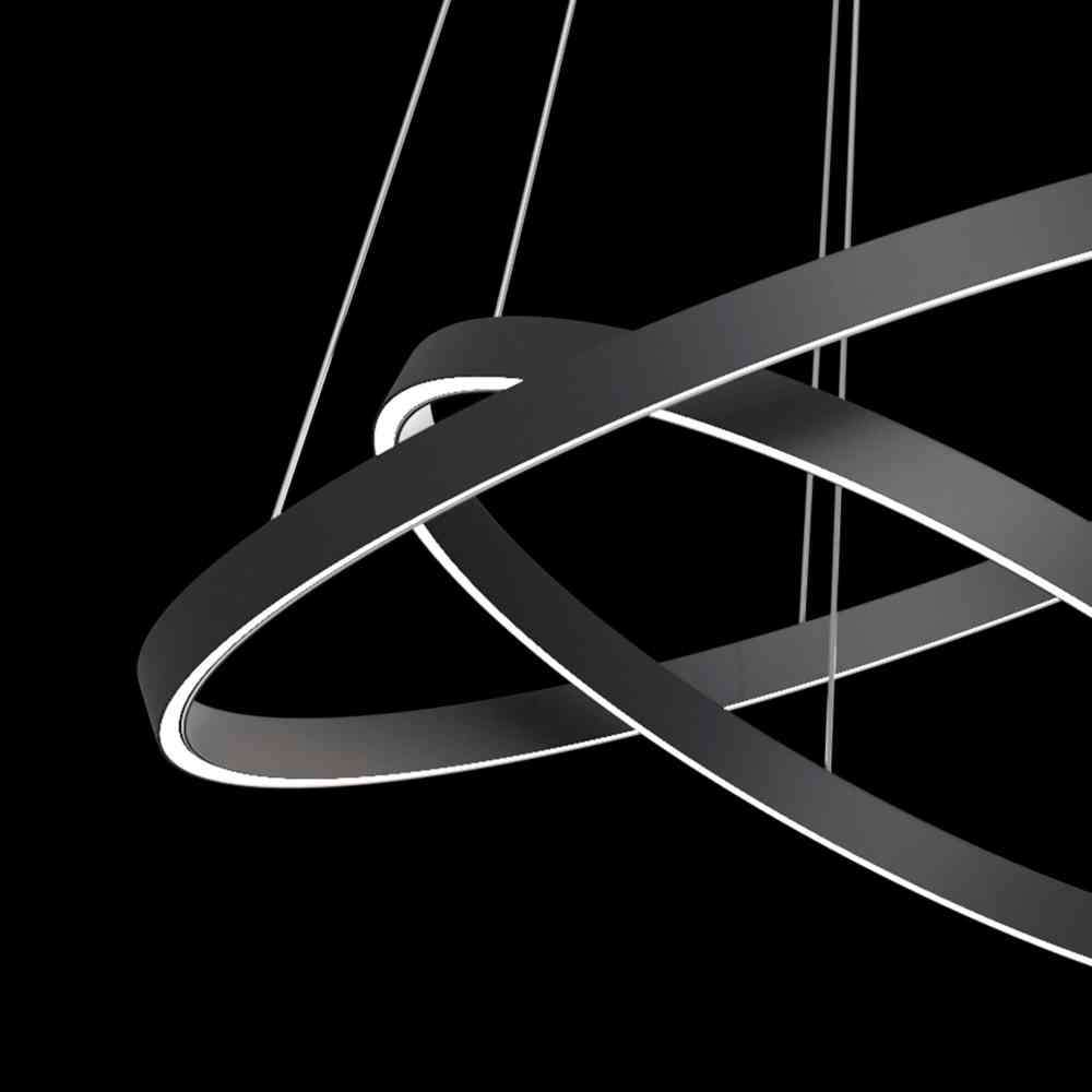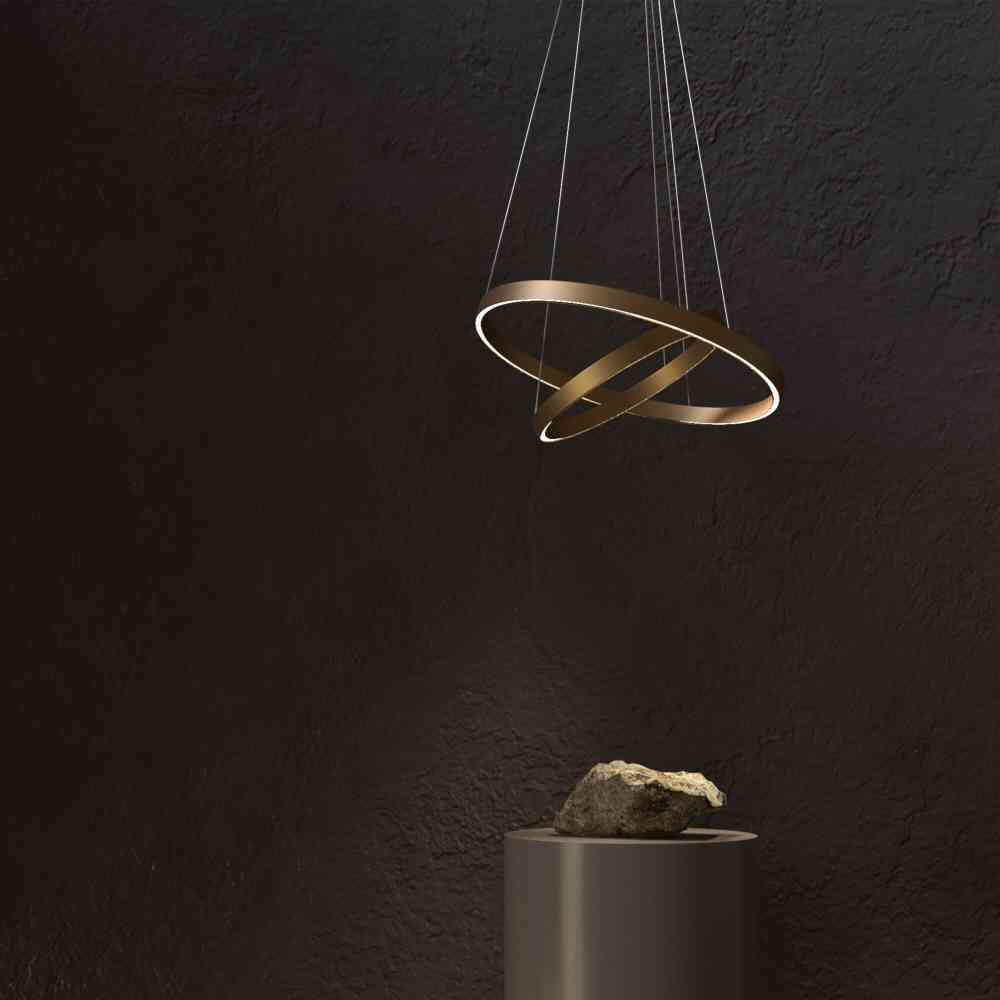 Lampa wisząca Obręcz . Model ma kształt metalowego pierścienia. Serię reprezentują oprawy o różnych rozmiarach w 3 kolorach: białym, czarnym i mosiężnym. Źródła światła LED.