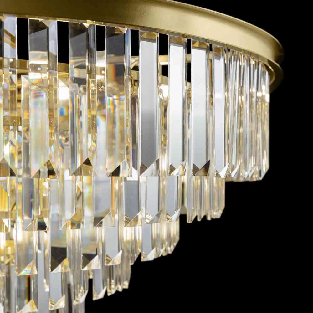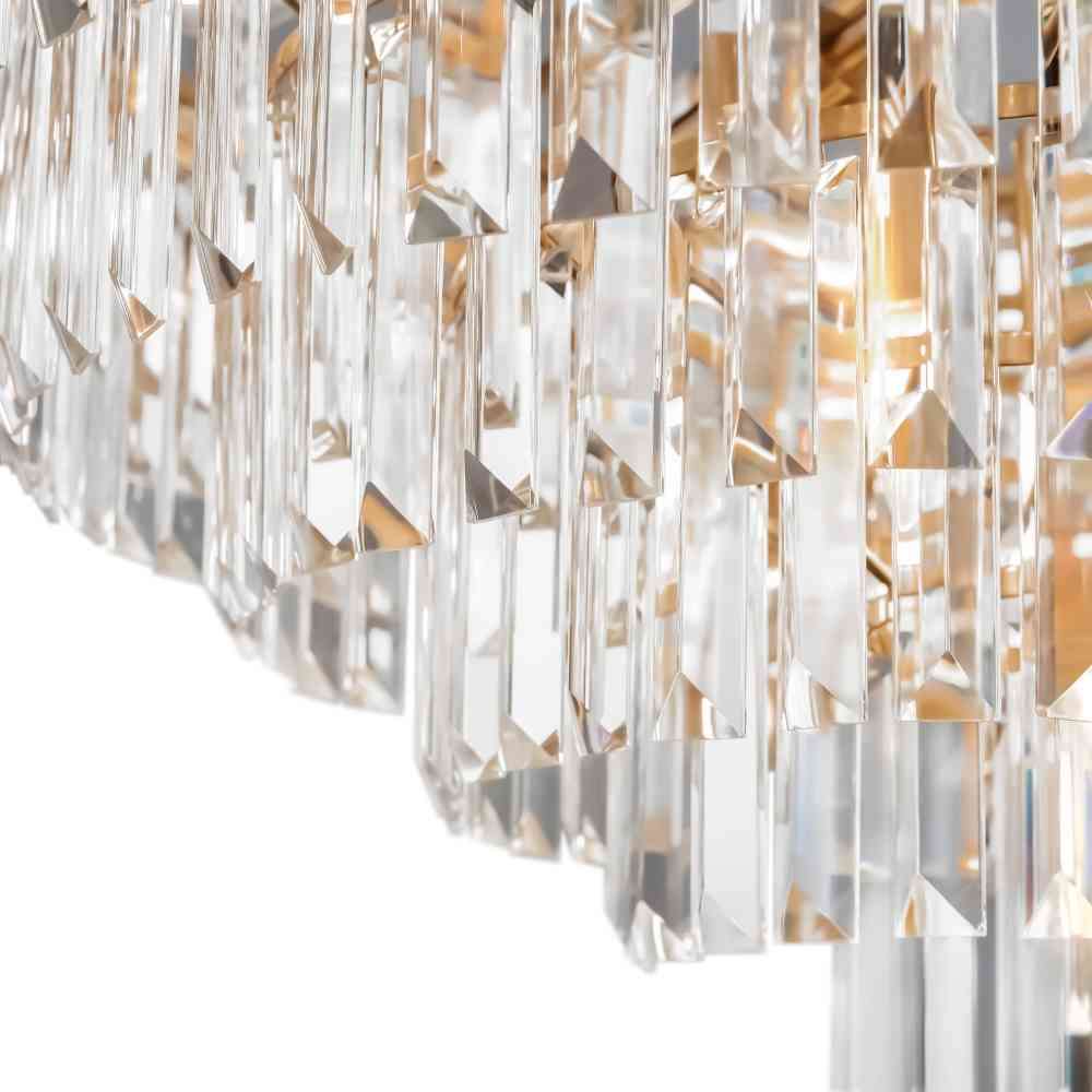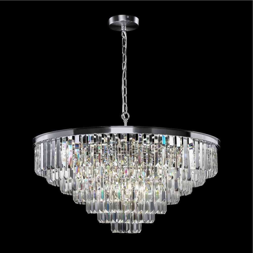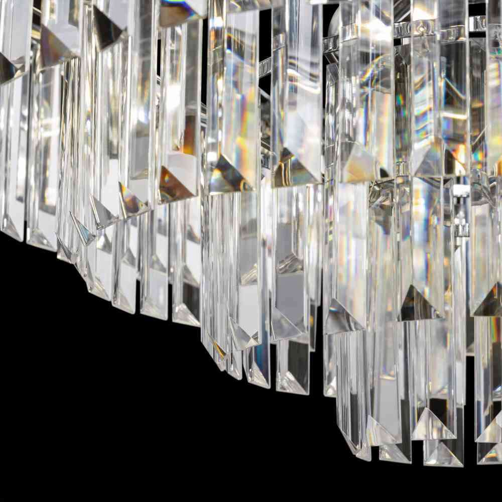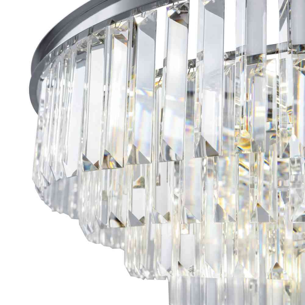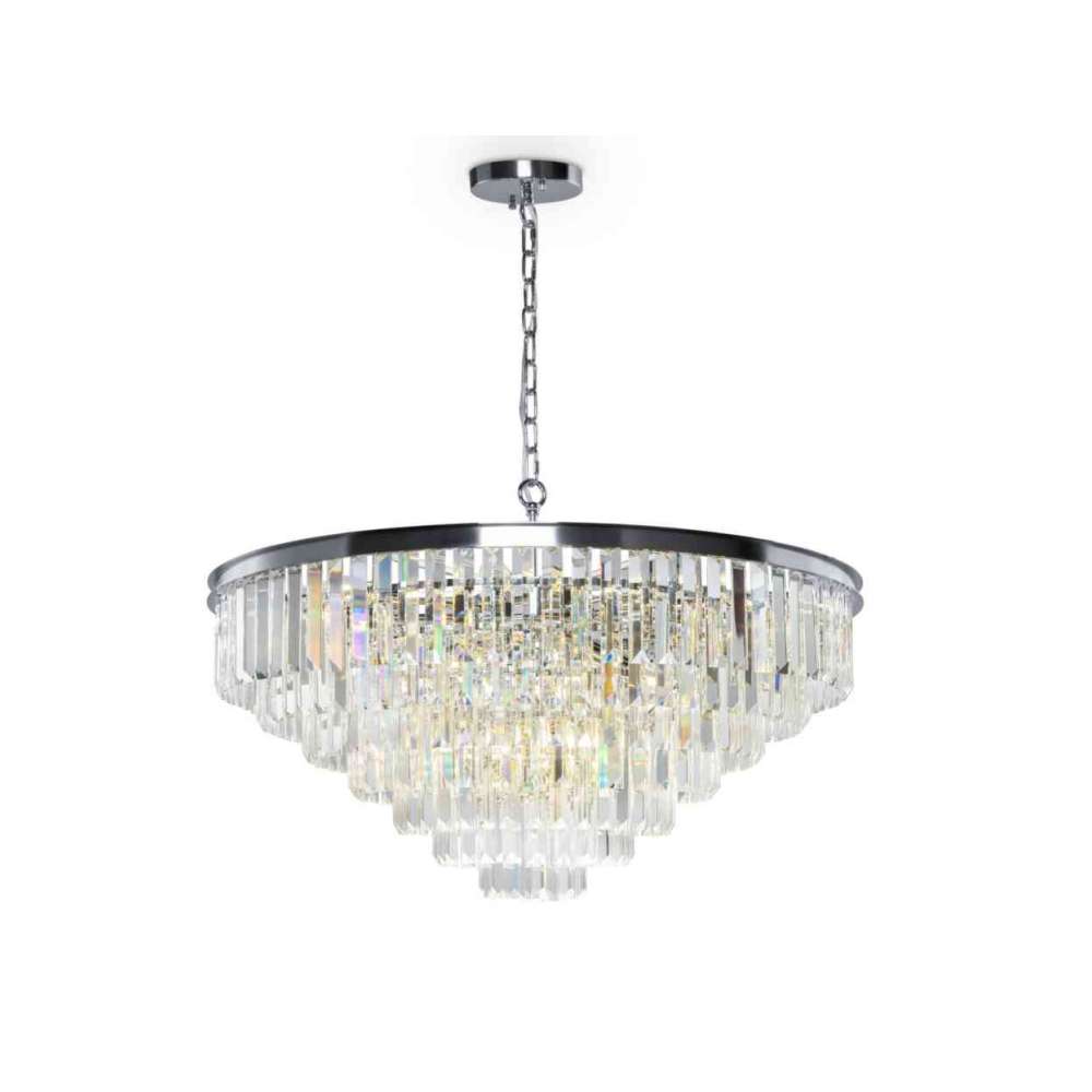 Wystrój: wielopoziomowe kryształowe wisiorki. Okucia metalowe malowane na kolor chrom lub mosiądz. Wysokość opraw jest regulowana.