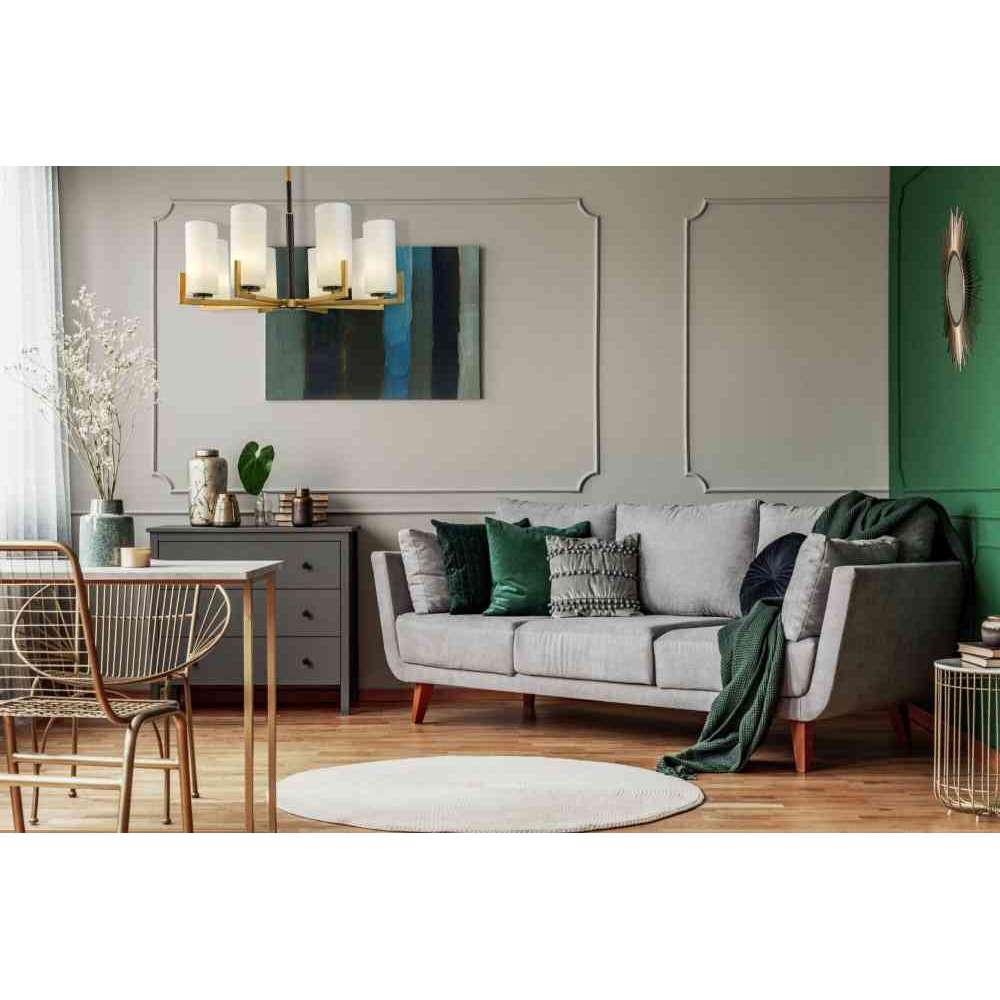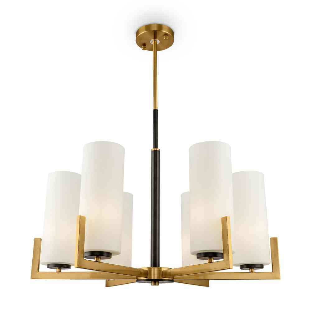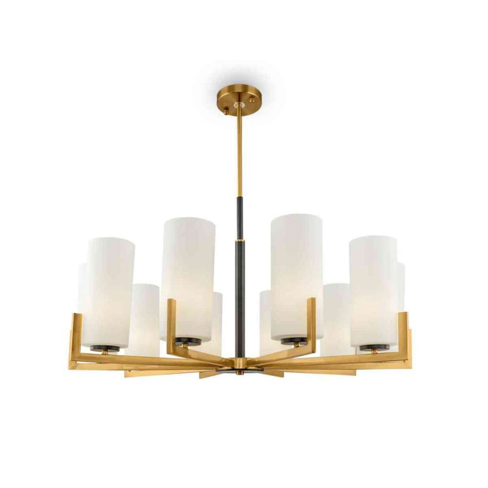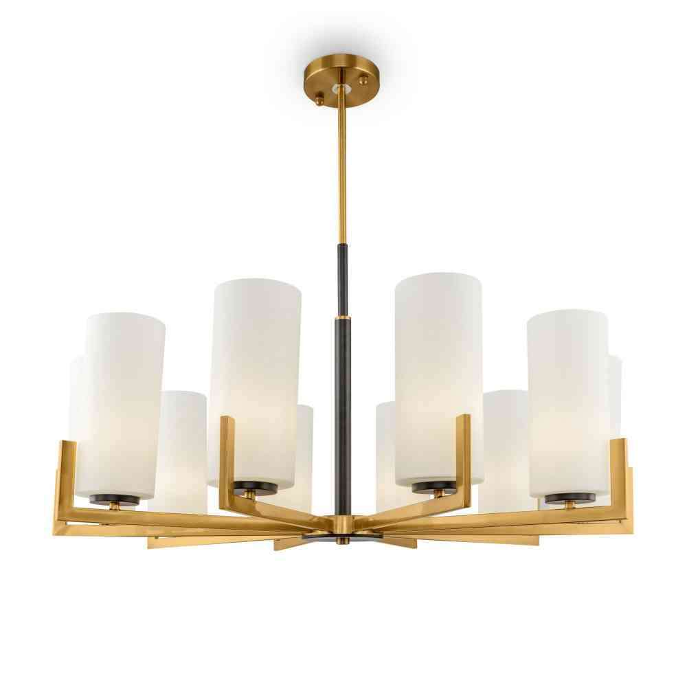Żyrandol Fortano. Białe cylindryczne klosze szklane. Okucia metalowe w kolorze mosiądzu. Seria obejmuje żyrandole na 6, 8 i 10 kloszy oraz oprawy ścienne.