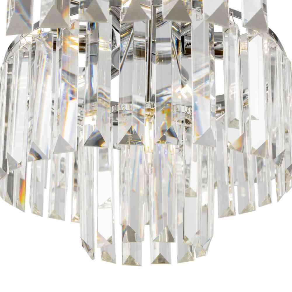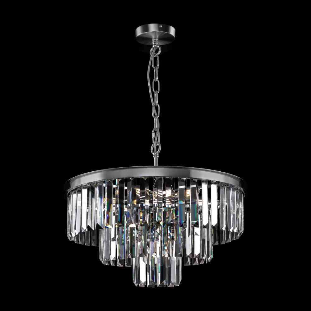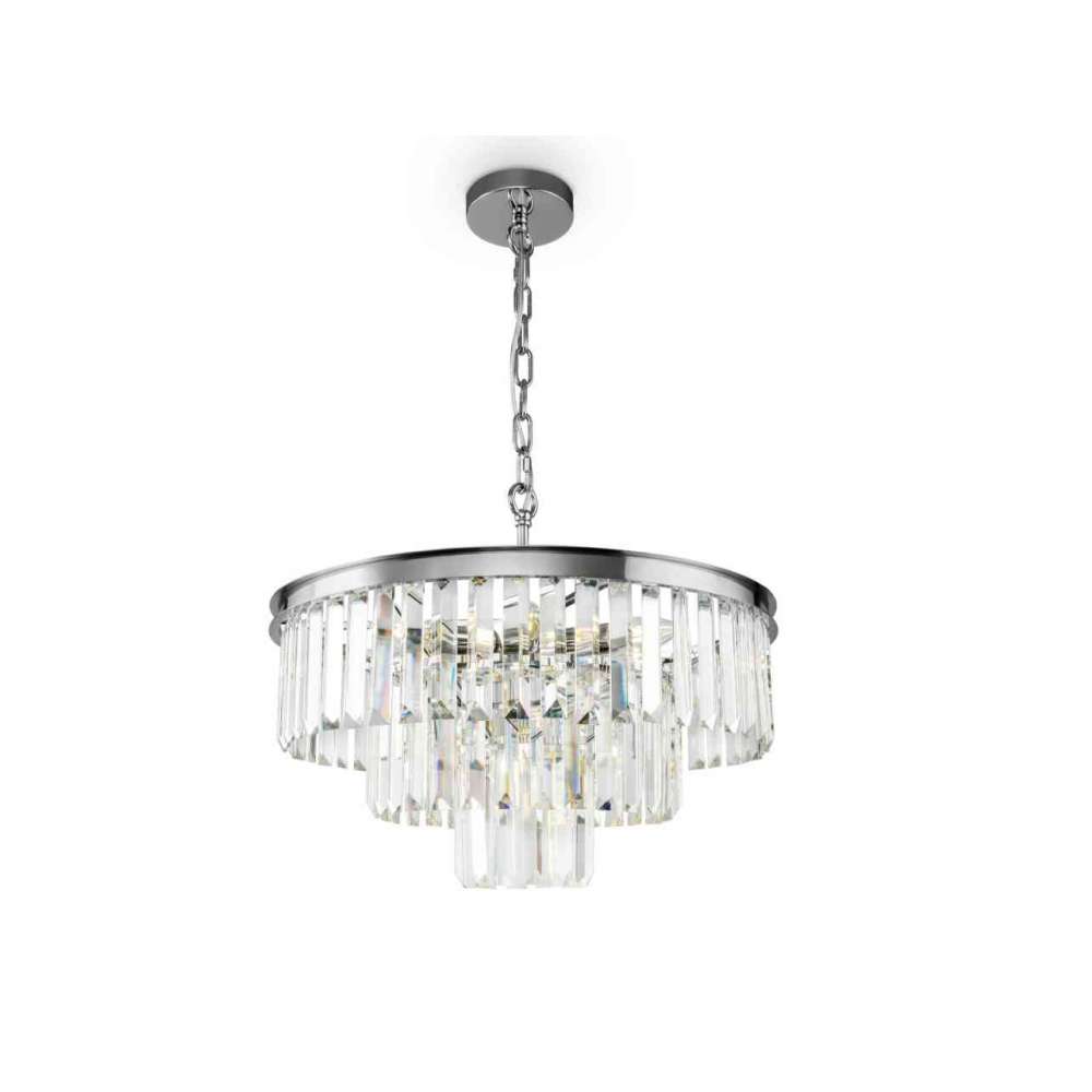 Wystrój: wielopoziomowe wisiorki kryształowe. Okucia metalowe malowane na kolor chrom lub mosiądz. Wysokość opraw jest regulowana.