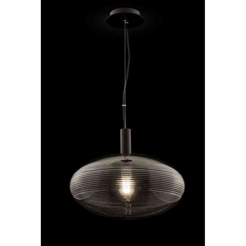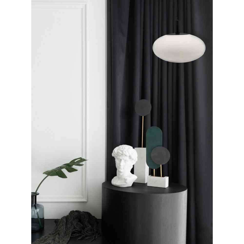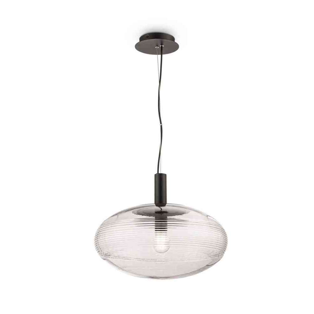 Szklane klosze są dostępne w jasnych i białych kolorach. Okucia są metalowe i pomalowane na czarno. Wysokość opraw regulowana jest długością kabla.