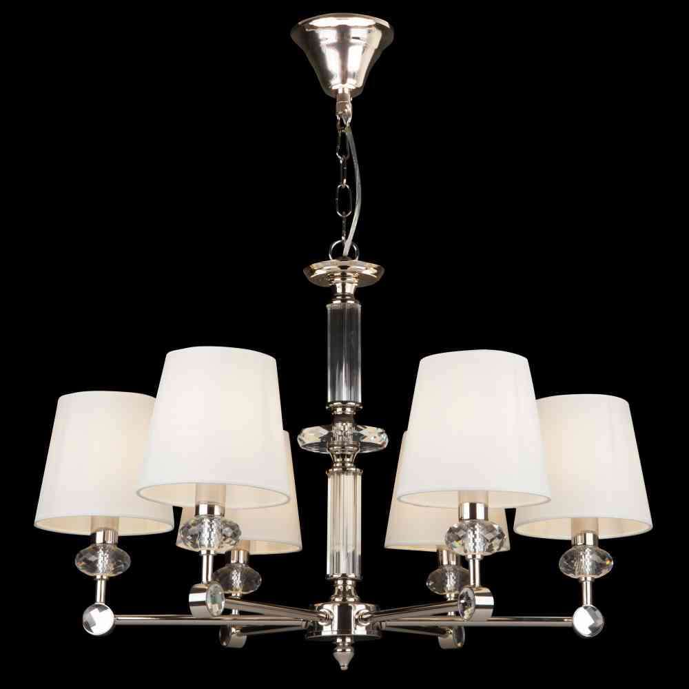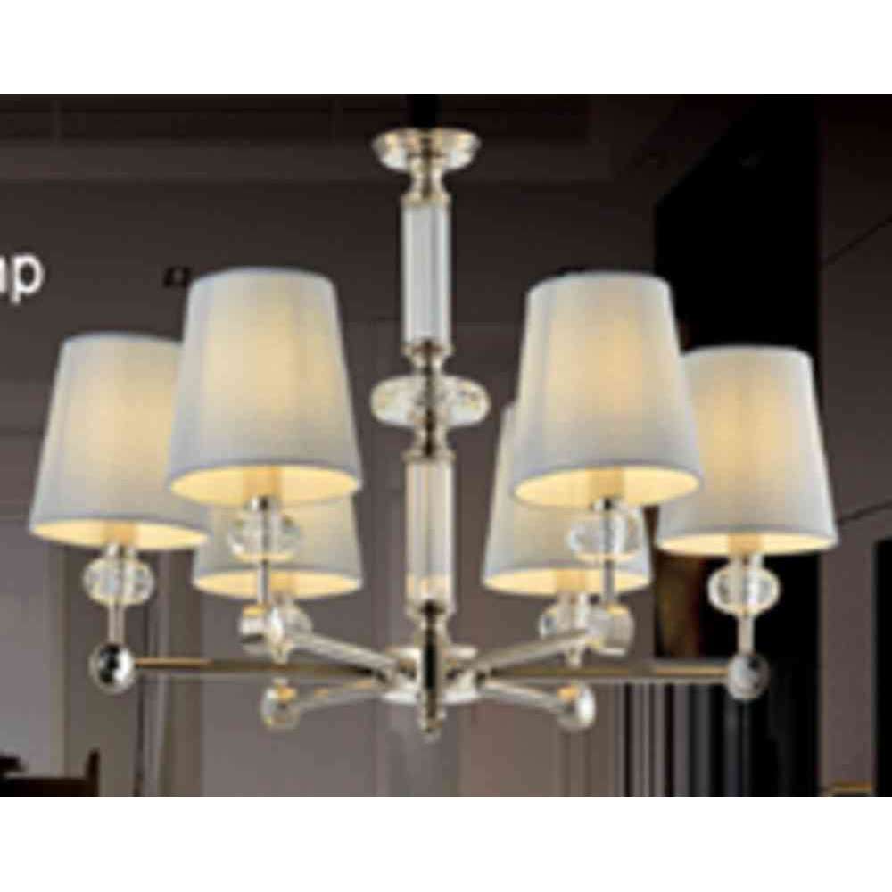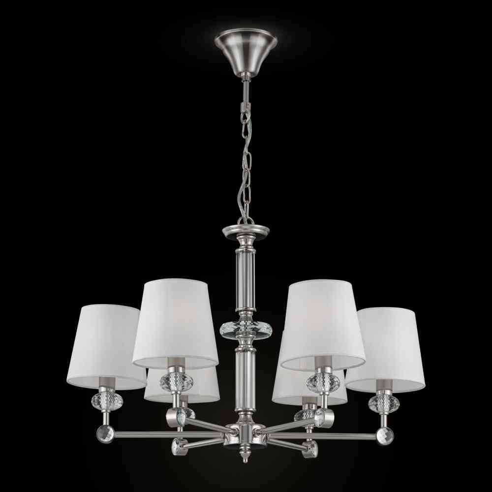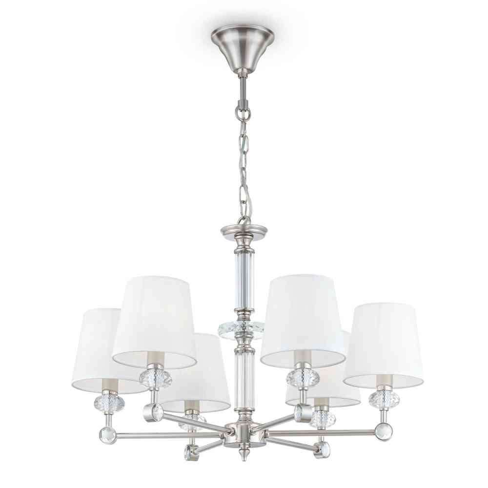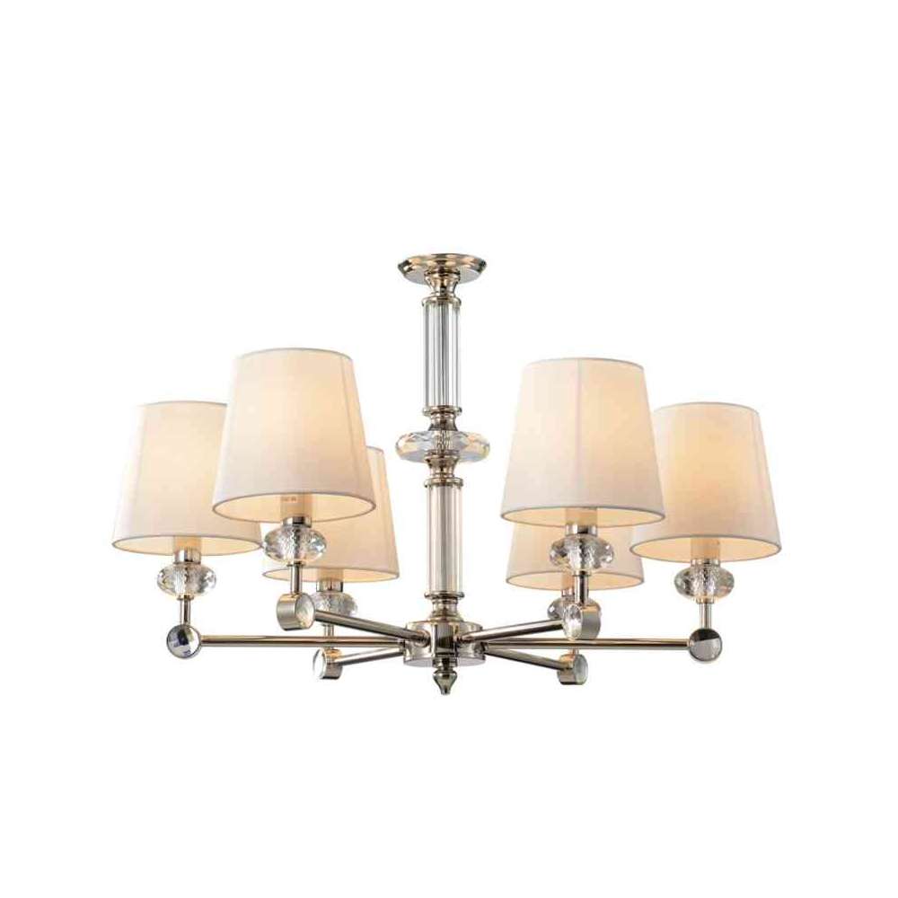 Żyrandol Riverside. Dane techniczne Kolor klosza: biały Minimalna wysokość, mm: 680 Maksymalna wysokość, mm: 1450 Żarówki: 6 X E14 (40W) Materiał podstawowy: Metal 2w1: Nie LED: Nie Średnica, mm: 660 Materiał klosza: Tkanina na PCV Rodzaj montażu: Na gnieździe Wysokość misy sufitowej , mm: 75 Średnica misy sufitowej, mm: 120 Typ mocowania sufitowego: Haczyk Długość łańcuszka, mm: 900 Żarówki w tym: Nie Kod kreskowy: 4251110073774 IP: IP20 Objętość opakowania, m³: 0,0605 Waga netto, kg: 4,65 Typ miejsca: Sala Balowa Gwarancja: 2 Oprawy serii Riverside polerowane stal nierdzewna ze szklanymi detalami. Seria obejmuje żyrandole z 15, 8 i 6 ramionami, kinkiety, lampy stołowe i stojące.Odbiorca: :