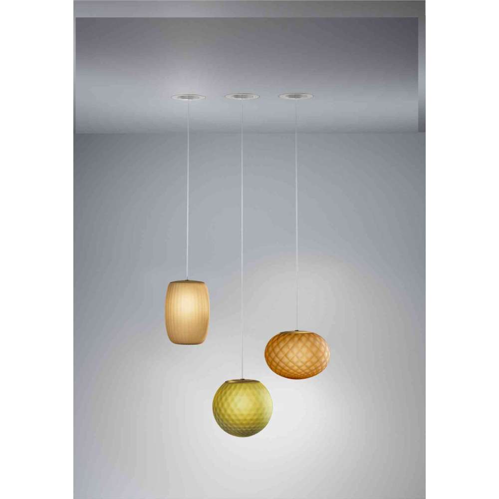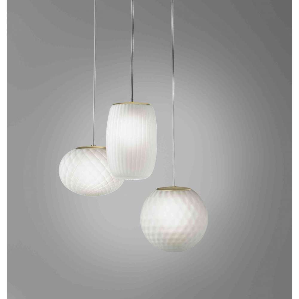 Lampy wiszące z matowego dmuchanego szkła, charakteryzujące się obróbką szkła zgodnie z technikami zdobniczymi rigadin, balloton i ballotondo, co nadaje Ely wykończenie w paski, Emy fakturę romboidalną, a Evy kulisty wzór. Baldachim sufitowy pomalowany matową mosiężną farbą poliakrylową. Światło rozproszone w żarówce LED G9 dostępne w katalogu, do zamówienia osobno. Dostępne kolory szkła to kryształ, stal, bursztyn, brąz, tytoń i zieleń. Przezroczysty kabel elektryczny. Dostępne są zadaszenia wpuszczane i zadaszenia dla wielu zawieszeń.