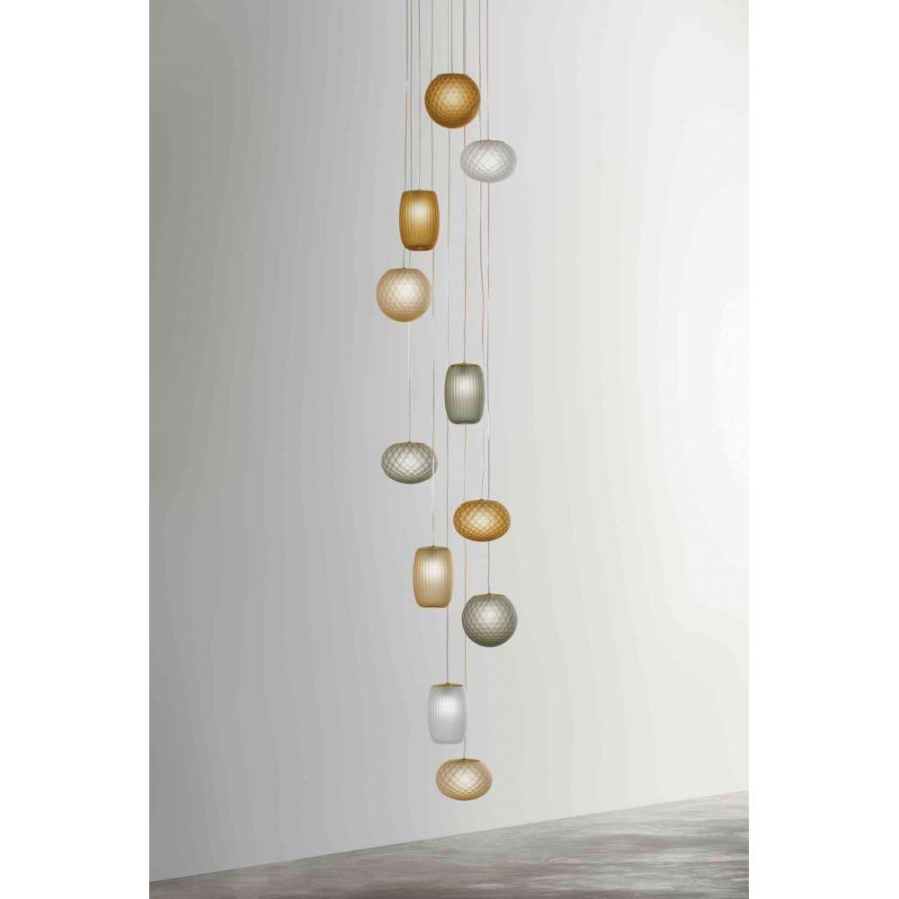 Lampy wiszące z matowego dmuchanego szkła, charakteryzujące się obróbką szkła zgodnie z technikami zdobniczymi rigadin, balloton i ballotondo, co nadaje Ely wykończenie w paski, Emy fakturę romboidalną, a Evy kulisty wzór. Baldachim sufitowy pomalowany matową mosiężną farbą poliakrylową. Światło rozproszone w żarówce LED G9 dostępne w katalogu, do zamówienia osobno. Dostępne kolory szkła to kryształ, stal, bursztyn, brąz, tytoń i zieleń. Przezroczysty kabel elektryczny. Dostępne są zadaszenia wpuszczane i zadaszenia dla wielu zawieszeń.