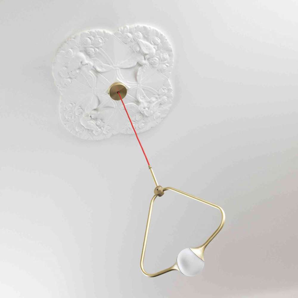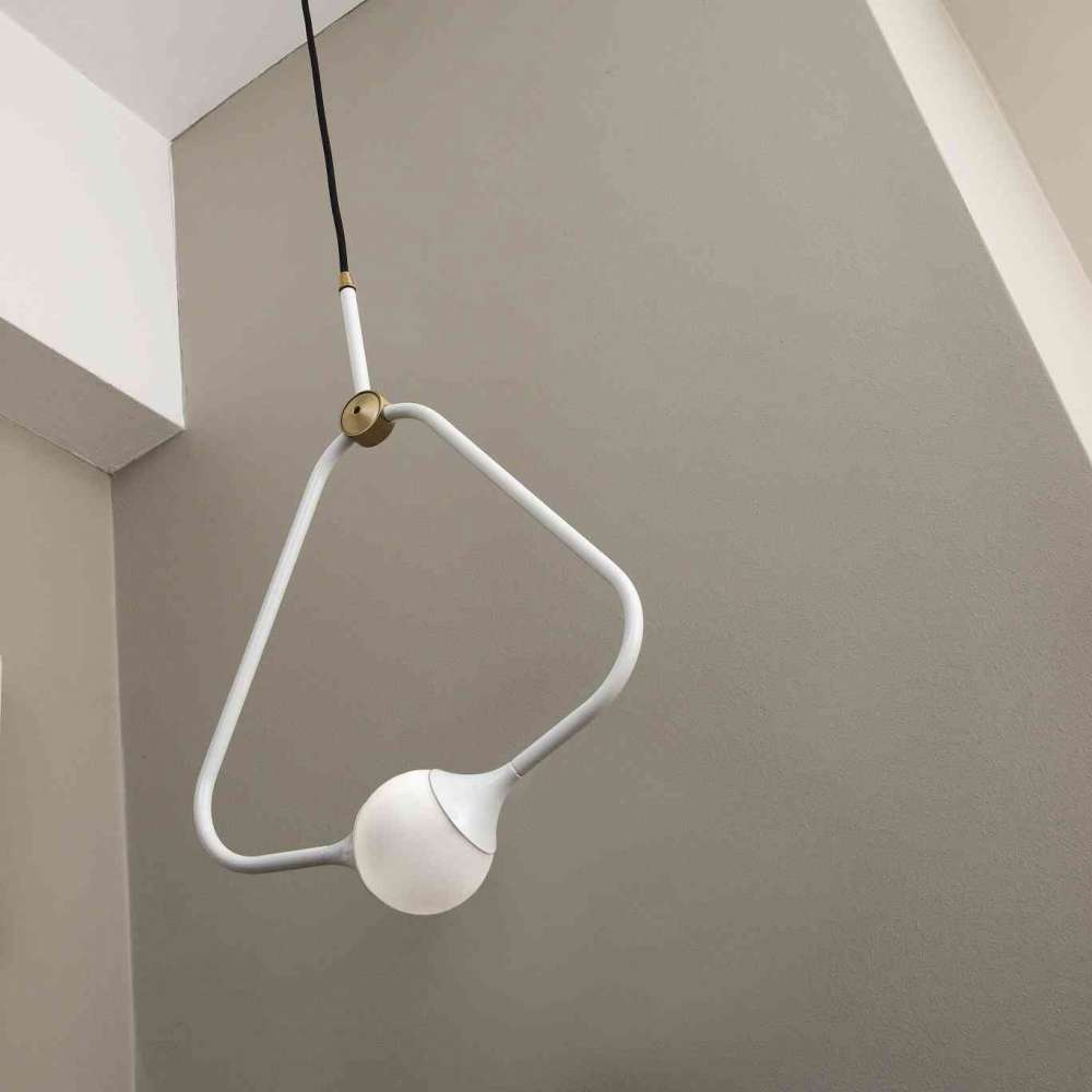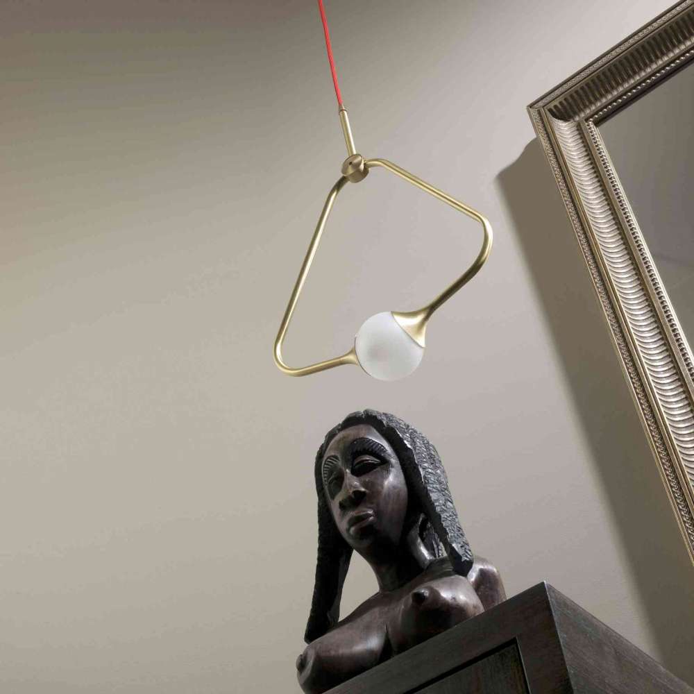 MEDAL - Intuicja jest zawsze ważne t w projektowaniu, ale tym bardziej dzisiaj w dobie nudnej masowej produkcji. Podkreślanie osobistych cech przedmiotów. Lampa wisząca Bullarum Medal składa się z ręcznie dmuchanej szklanej kuli w oprawie ze szczotkowanego mosiądzu z okrągłym mosiężnym akcentem. Prosty w kształcie, ale pełen osobowości, trójkątny Medal wisi zarówno w eleganckim salonie, jak i w przytulnej sypialni — elegancki wgląd w oświetlenie. Korpus lampy jest ręcznie wykręcany z mosiądz, który łączy się z ręcznie dmuchaną szklaną kulą, która pięknie rozprasza światło. Węzeł z białego szkła i mosiądzu. Wykończony czarnym bawełnianym sznurkiem o długości 2 m. Żarówka G9 maks. 35 W. Wys: 41 cm Szer: 34cm Długość zawieszenia: 70-150 cm