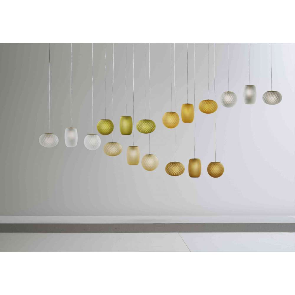Lampy wiszące z matowego dmuchanego szkła, charakteryzujące się obróbką szkła zgodnie z technikami zdobniczymi rigadin, balloton i ballotondo, co nadaje Ely wykończenie w paski, Emy fakturę romboidalną, a Evy kulisty wzór. Baldachim sufitowy pomalowany matową mosiężną farbą poliakrylową. Światło rozproszone w żarówce LED G9 dostępne w katalogu, do zamówienia osobno. Dostępne kolory szkła to kryształ, stal, bursztyn, brąz, tytoń i zieleń. Przezroczysty kabel elektryczny. Dostępne są zadaszenia wpuszczane i zadaszenia dla wielu zawieszeń.