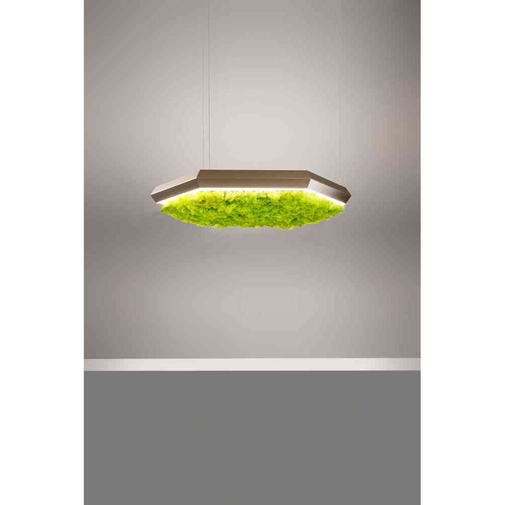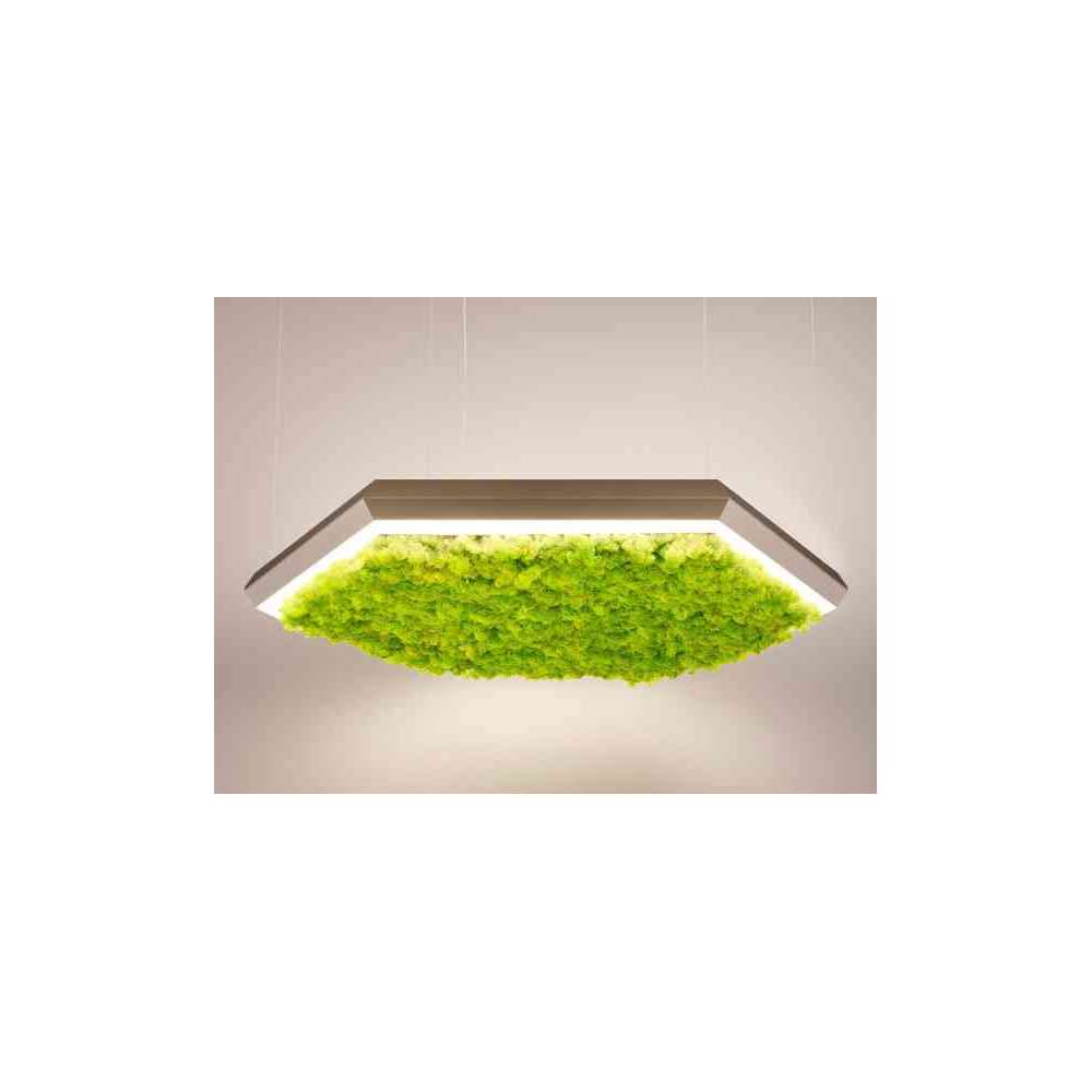 Exagon Silence Green Lampa wisząca Exagon Silence Green umożliwia tworzenie sześciokątnych kompozycji oraz rozproszonego światła w górę iw dół. ExagonSilence Green jest przeznaczony do wyposażenia i zapewnienia komfortu w miejscach publicznych, takich jak biura, restauracje, salony i hotele. Lampa wisząca Exagon Silence Green rozpraszająca światło skierowane w górę i w dół zawiera również panele dźwiękochłonne, które redukują hałas w miejscach publicznych. Naturalny stabilizowany porost jest wykonywany ręcznie: - pozostaje świeży i miękki w czasie: - antystatyczny: - nie rośnie: - nie potrzebuje wody: - jest środowisko nieprzyjazne dla owadów: - certyfikat pochłaniania dźwięku - zgodnie z normą UNI EN ISO 354:2003 – 11654:1998: - certyfikat odporności na ogień - zgodnie z normą UNI EN 13501-1: 2009 B-s2, d0-USA ASTM E 84:2003, KLASA A.Odbiorca: :
