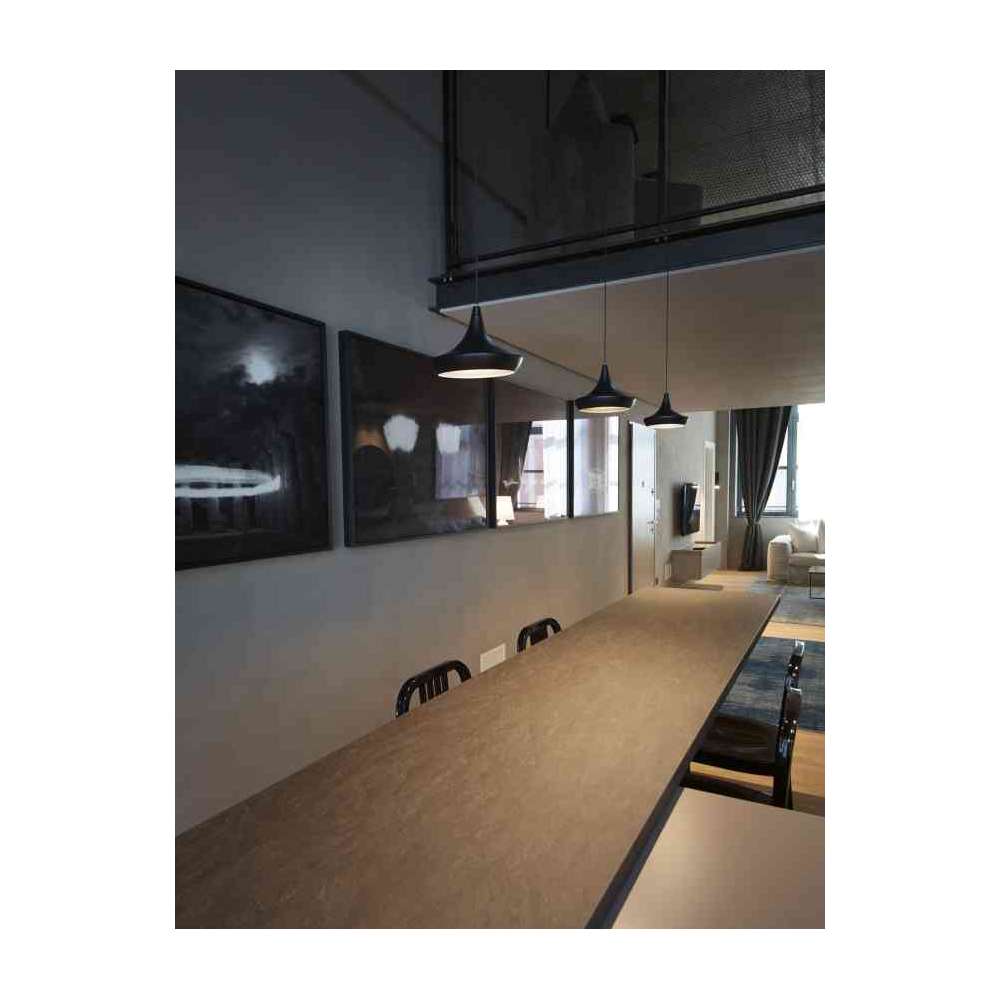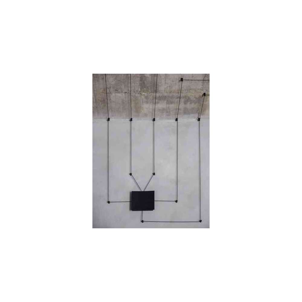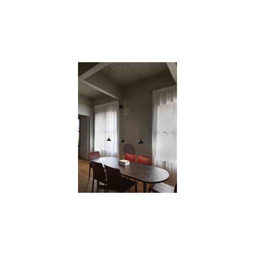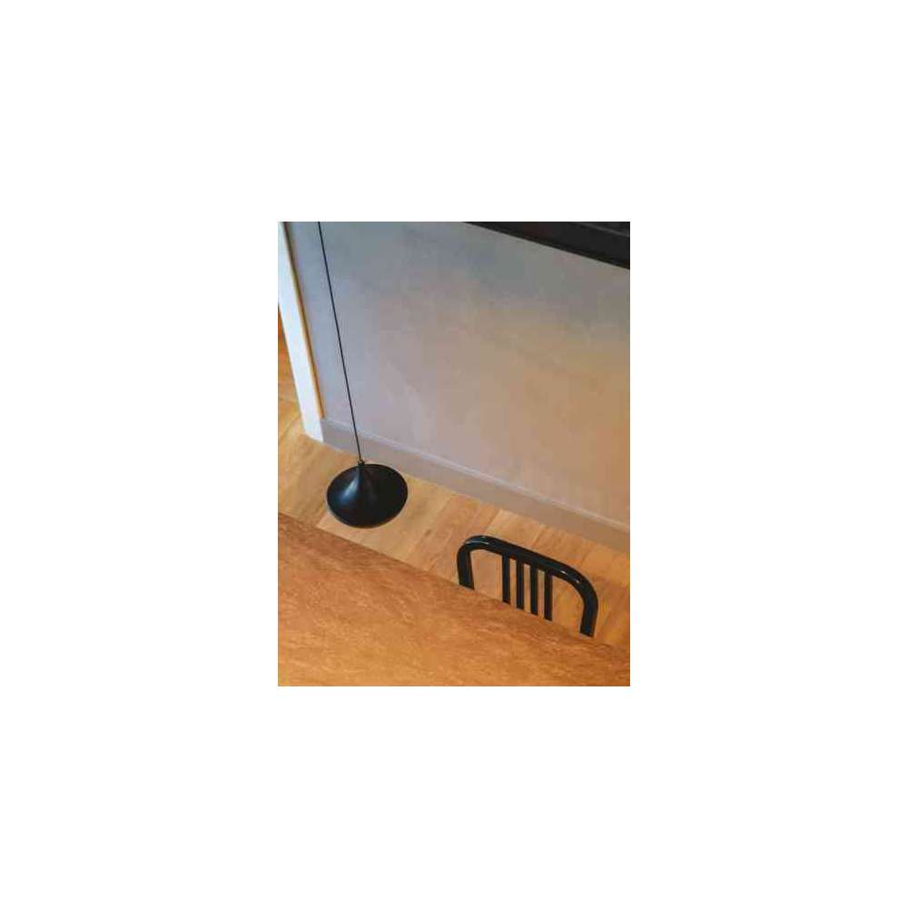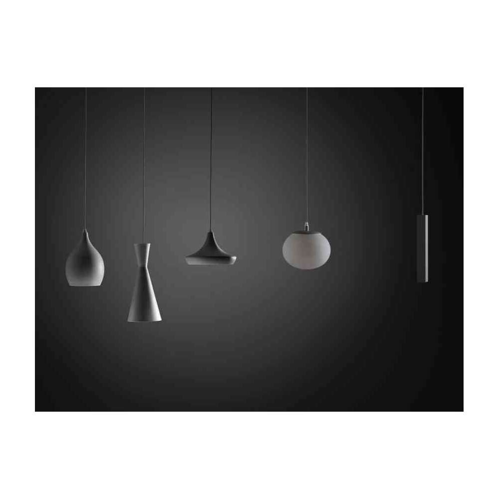 Zawieszenie z toczonego aluminium pomalowane na kolor biały, piaskowy, czarny i szary wyposażone w 8w diodę LED o mocy 900 lumenów wyposażone wewnętrznie w szpulę do odzyskiwania nadmiaru kabla (do 2 metrów) oraz z połączeniem przez gniazdo dla szybkiego i bezpiecznego połączenia do podstawy z zasilaczem.
