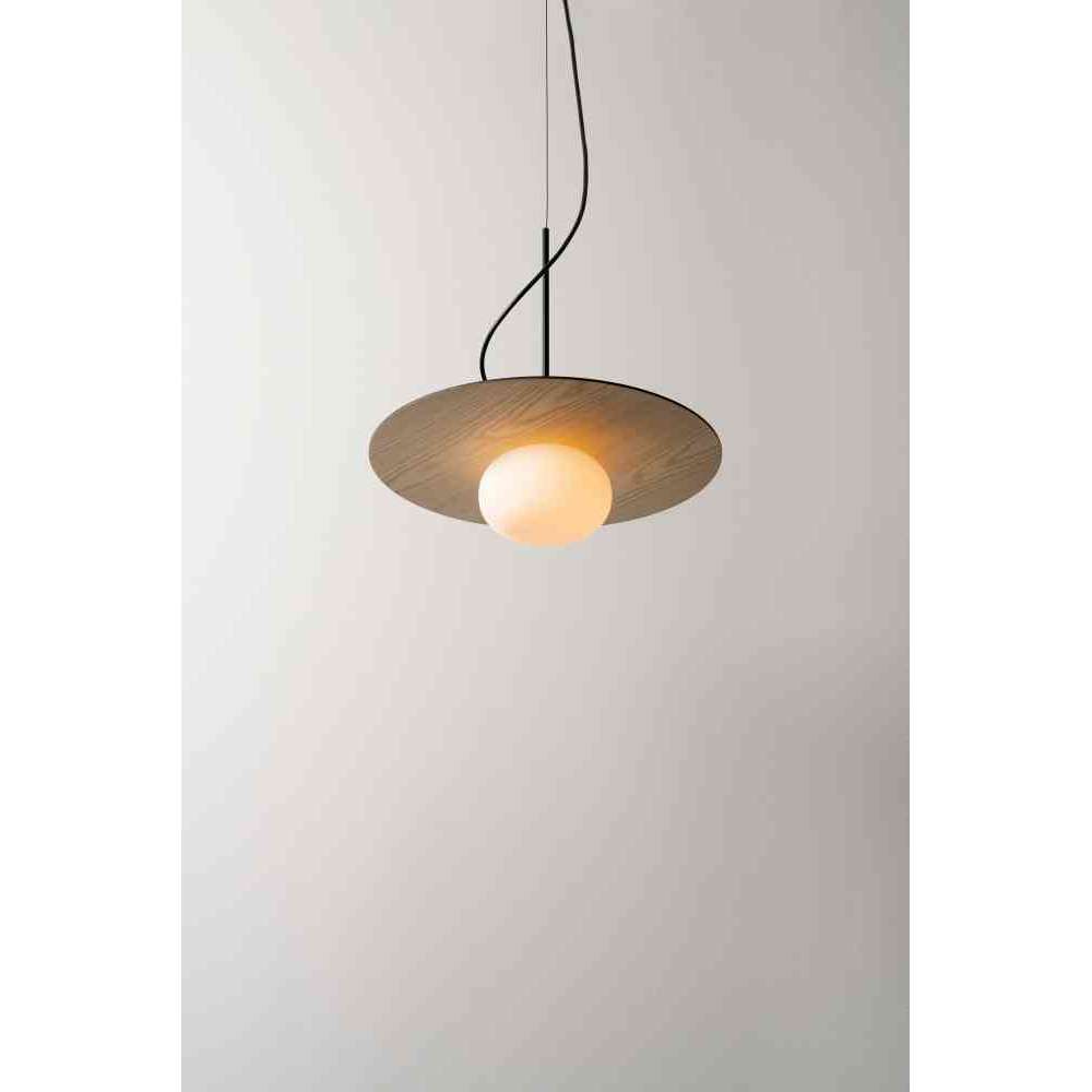 Knock to lampa wisząca wykonana z drewna jesionowego i dmuchanego szkła.