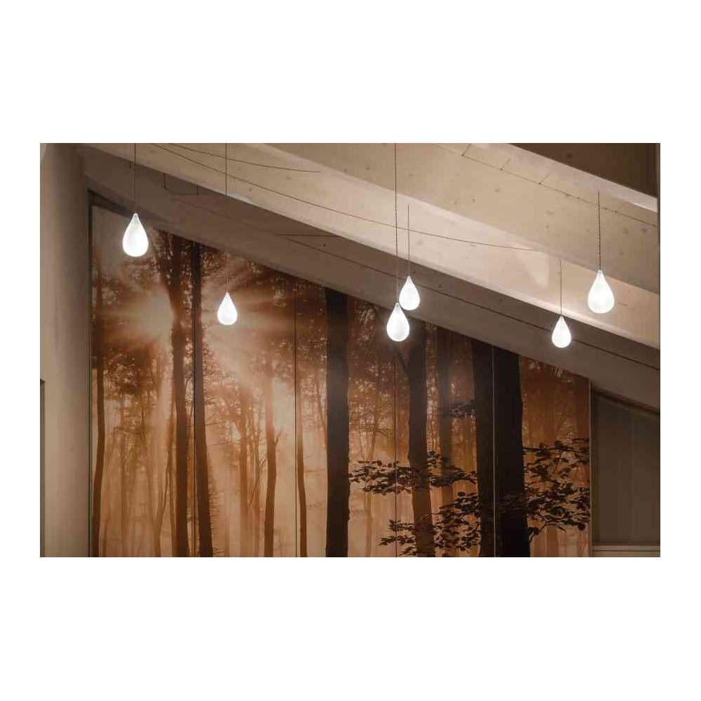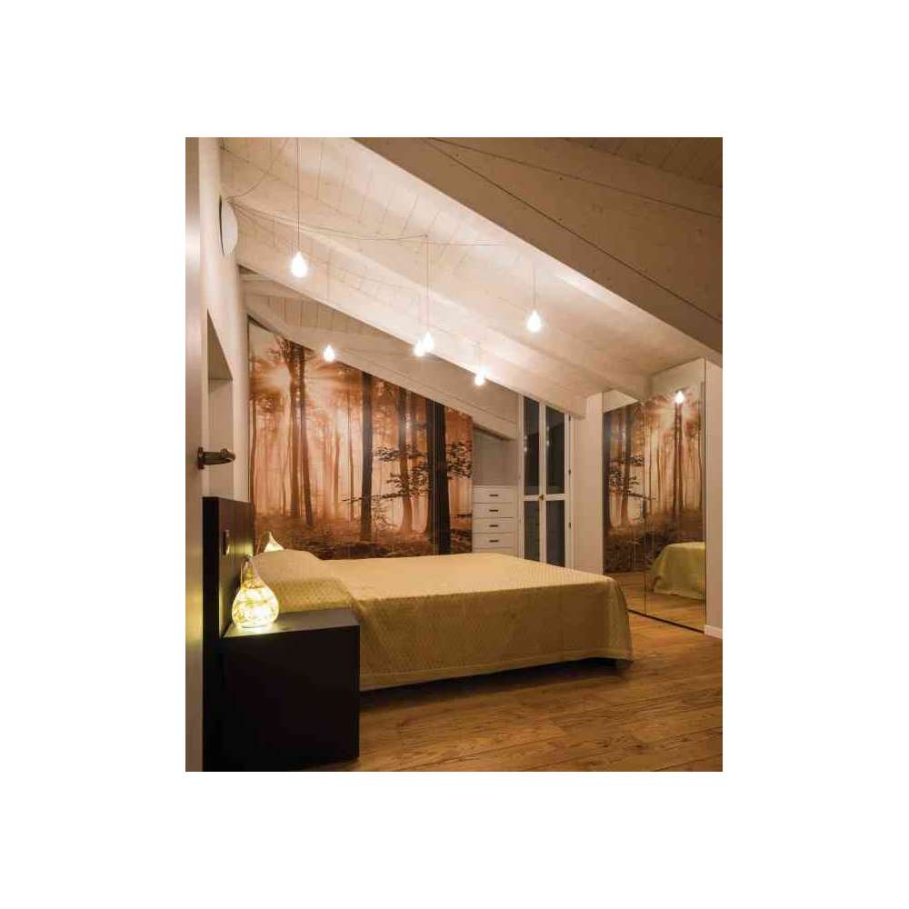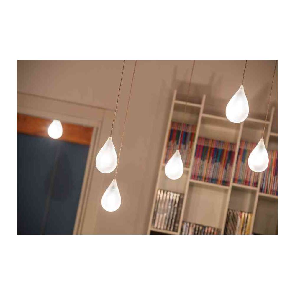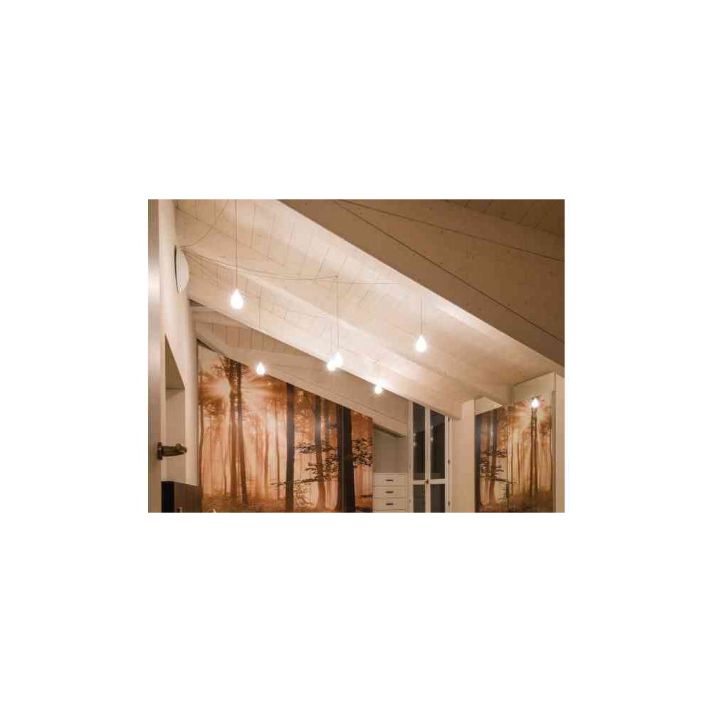 Sciame Goccia to lampa wisząca z baldachimem, którą można umieścić na ścianie lub suficie. 6, 9 lub 12 opraw oświetleniowych Goccia można zawiesić w ręcznie dmuchanym szkle borokrzemianowym w przezroczystych lub matowych wykończeniach. w szkle matowym o średnicy 20 lub 32 cm. Może być stosowany z żarówkami LED G4 12V max 20W.