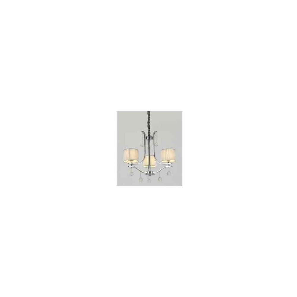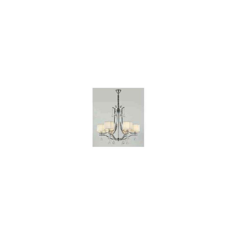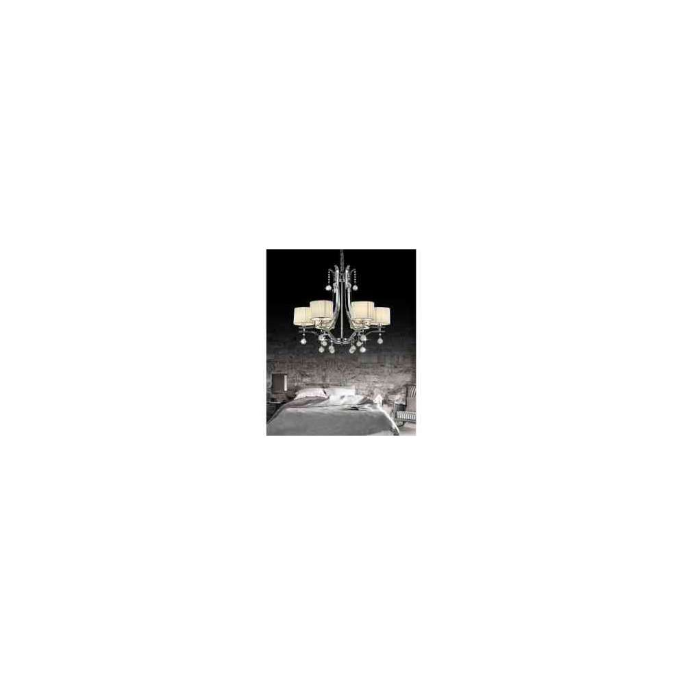 Fontenea to metalowy żyrandol z kryształkami i abażurami z ognioodpornej tkaniny. Dostępna w wersji z 3 lub 6 punktami świetlnymi z gniazdem E14, napięcie 220-240V, moc 40W. Nadaje się do wszystkich rodzajów żarówek, brak w zestawie.