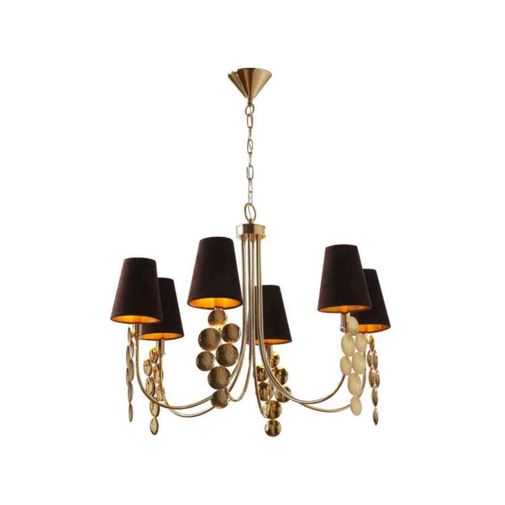 Wyposażony w aksamitne abażury i bogate złote krążki, Ethnic jest nowoczesnym, sześcioramiennym żyrandolem z mosiądzu. Z każdej lampy zwisa sześć złotych dysków, które mają wykończenie na wysoki połysk i teksturowaną powierzchnię. Sześć stożkowych kloszy jest z czarnego aksamitu z luksusowym złotym płótnem w środku. Idealny nad stołem jadalnym lub w salonie.Odbiorca: :