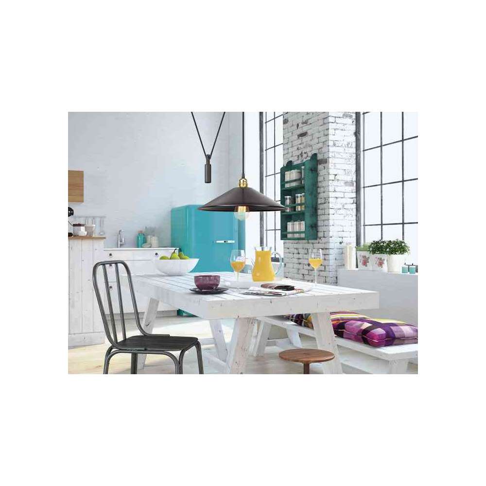Lampa wisząca Harlem z metalowym kloszem jest inspirowana stylem vintage i jest idealna do projektów gastronomicznych, jadalni i kuchni. Jej wersja z krążkiem jest wyposażona w przeciwwagę i mechanizm krążka, który umożliwia regulację wysokości kabli. Materiały i wykończenia Rozeta sufitowa w kolorze czarnym lub tlenkowym Metaliczny klosz i system kół pasowych w kolorze czarnym lub tlenkowym Czarny bawełniany lub brązowy kabel w oplocie Właściwości elektryczne 1 x żarówka E-27 vintage LED Max. 42 W (żarówka nie jest dołączona)Odbiorca: :